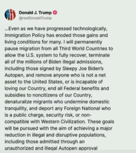 一、美国不接纳第三世界国家的人,二、所有拜登时期非法入境的,全部驱逐,三、想占美国的便宜不行了,终止向非美国公民发放联邦福利。