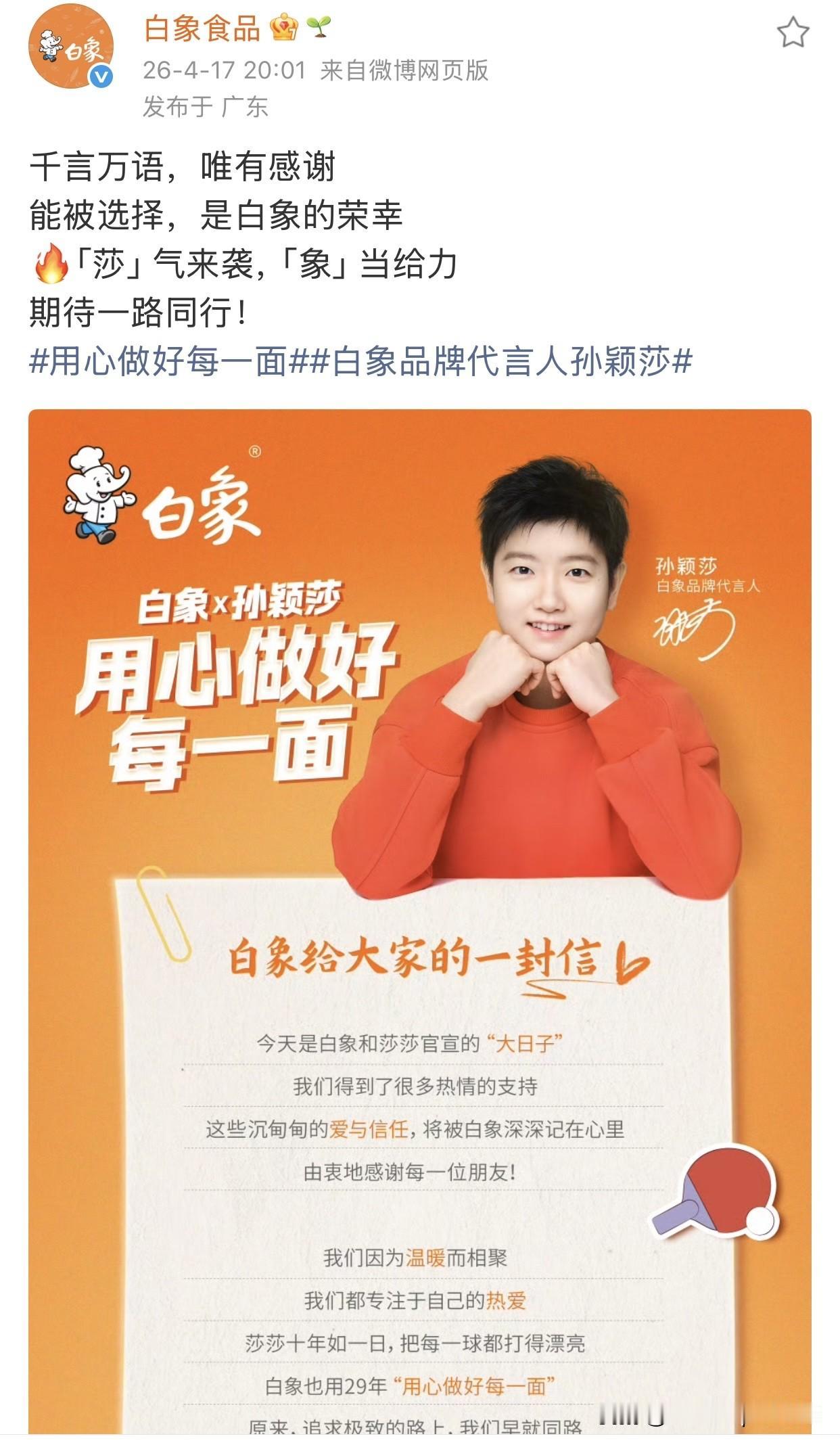 晚上8点,发感谢信,直言“能被选择,是白象的荣幸”;