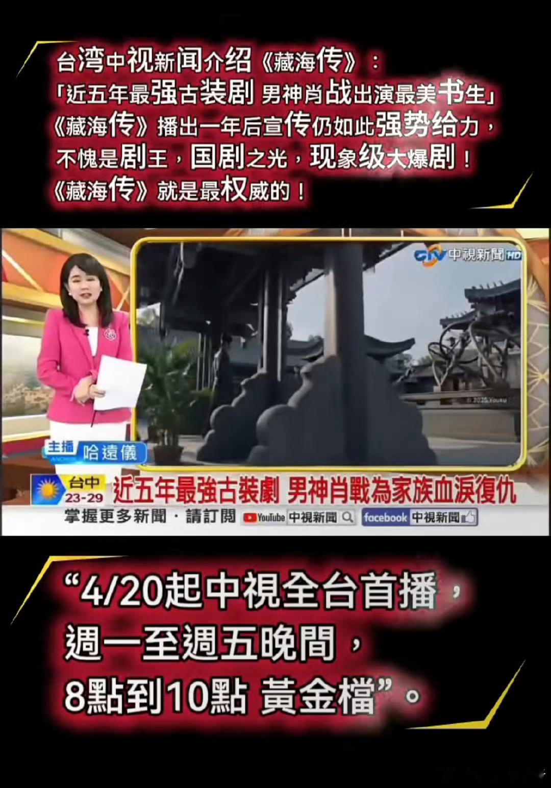 台湾中视称藏海传是近五年最强古装剧 台湾中视大力宣传藏海传为近五年最强古装剧,藏海传无论从制作,剧情,拍摄,肖战和其他演员的表演,都是精良精品,这也是这部剧在台湾被力捧的最大原因。国剧走出国门,一定是正向正面和能代表我们国家制作水平的剧。