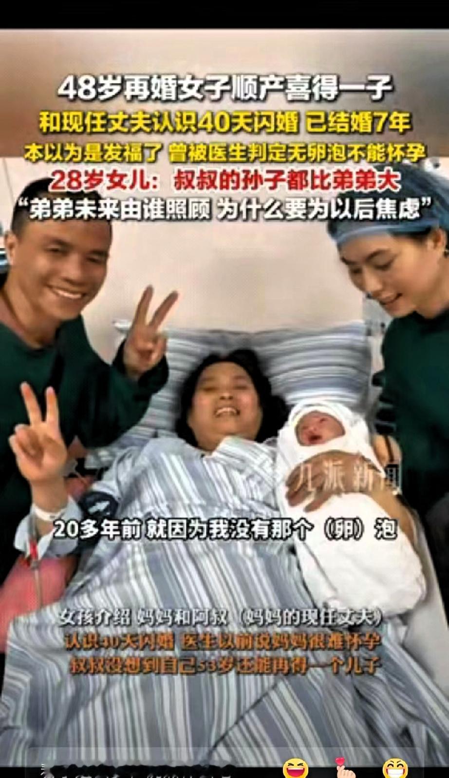 更让人感慨的是,她的丈夫53岁,家中孙子已经三岁,小儿子的出生让家里辈分变得格外有趣,孙子比叔叔还要年长。虽然属于高龄产妇,但她身体素质不错,整个生产过程十分顺利,仅用15分钟便平安顺产下男婴。