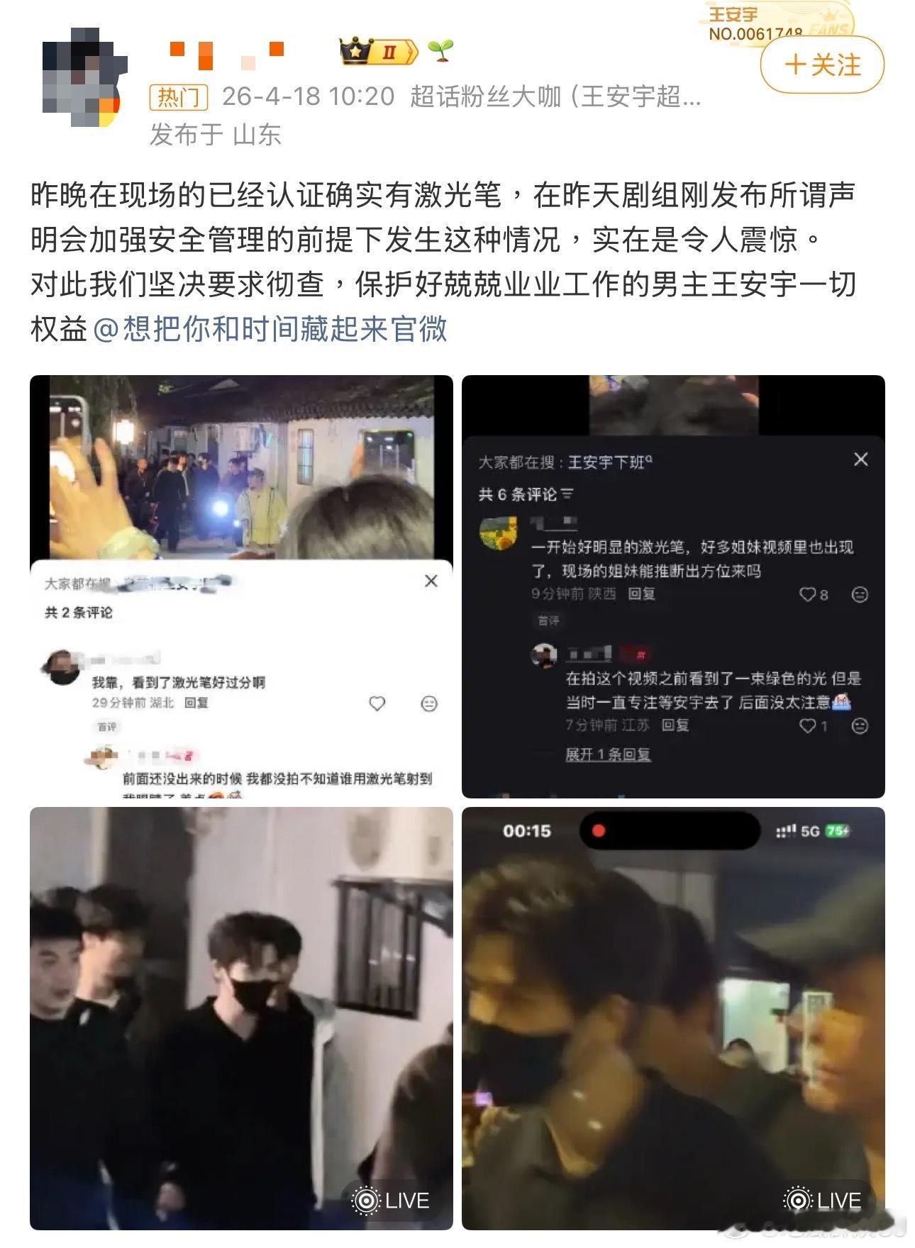 一波未平一波又起,《想把你和时间藏起来》剧组的管理也太有问题了吧,昨天才回应完章若楠被突然叫名字拍摄的事,王安宇粉丝也开始维权,因为有人堵在下班路上用激光笔照王安宇……