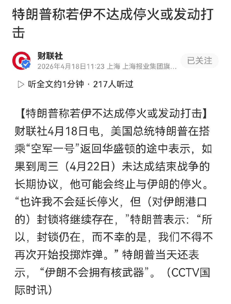 4月22日谈不成就终止停火、重新投炸弹。但注意——他说“封锁继续”,等于压根没松过手。这叫谈判吗?这叫拿枪顶脑门上逼人签字。