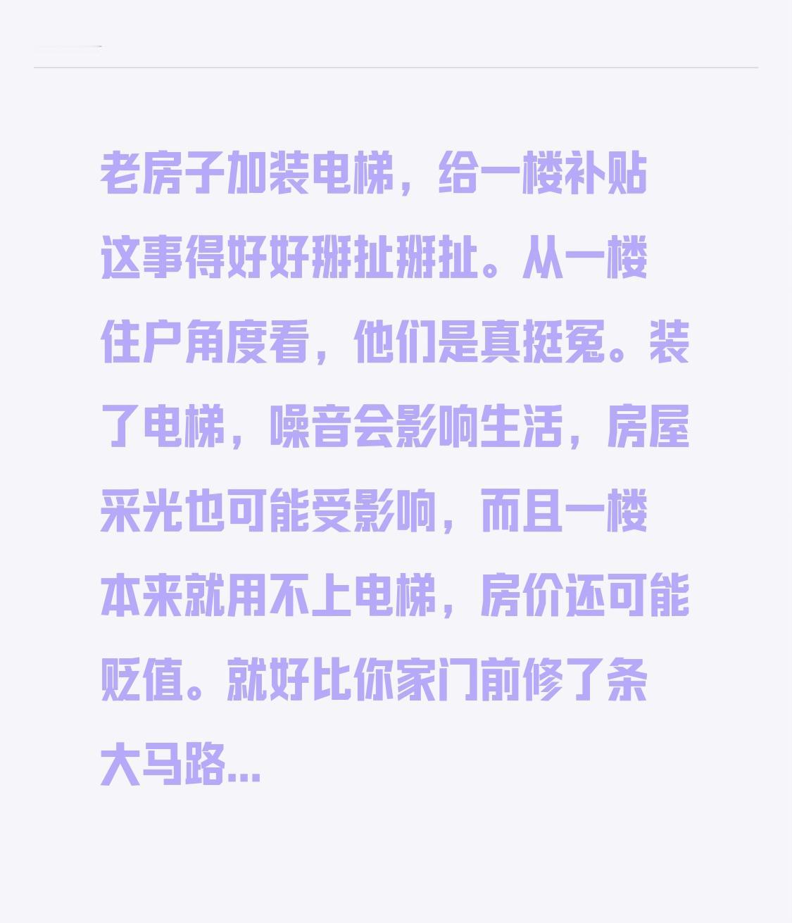 从一楼住户角度看,他们是真挺冤。装了电梯,噪音会影响生活,房屋采光也可能受影响,而且一楼本来就用不上电梯,房价还可能贬值。就好比你家门前修了条大马路,噪音大还不安全,你能乐意不?