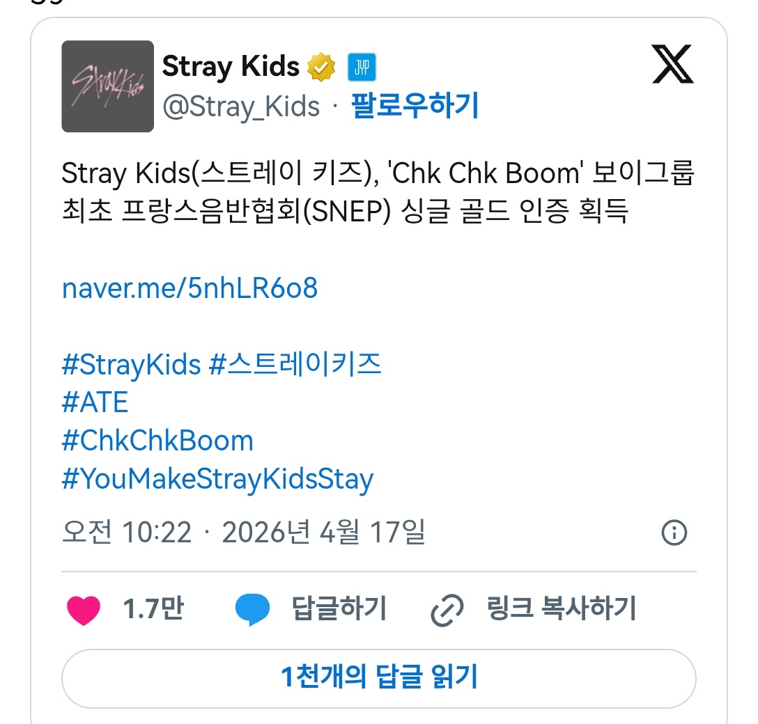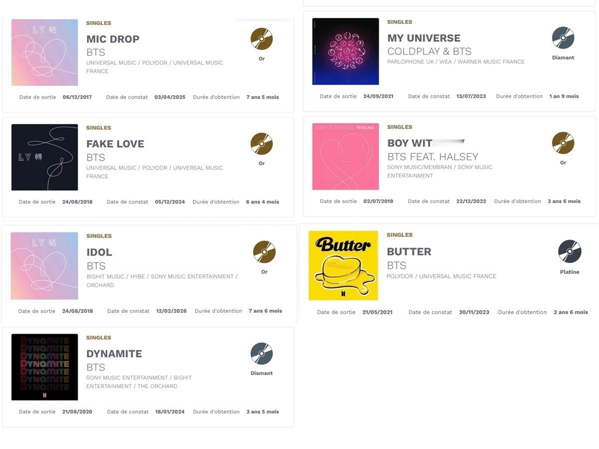 - 事由:2024年7月19日StrayKids发行的《ATE》主打曲《Chk Chk Boom》在法国获得1500万流媒体,获得单曲金唱片认证。是第4代K-pop最初,男团第2个获这一荣誉。但报道中写道是男团最初,因此得到ARMY的集体抗议。- P3:BTS历代获得的金唱片认证