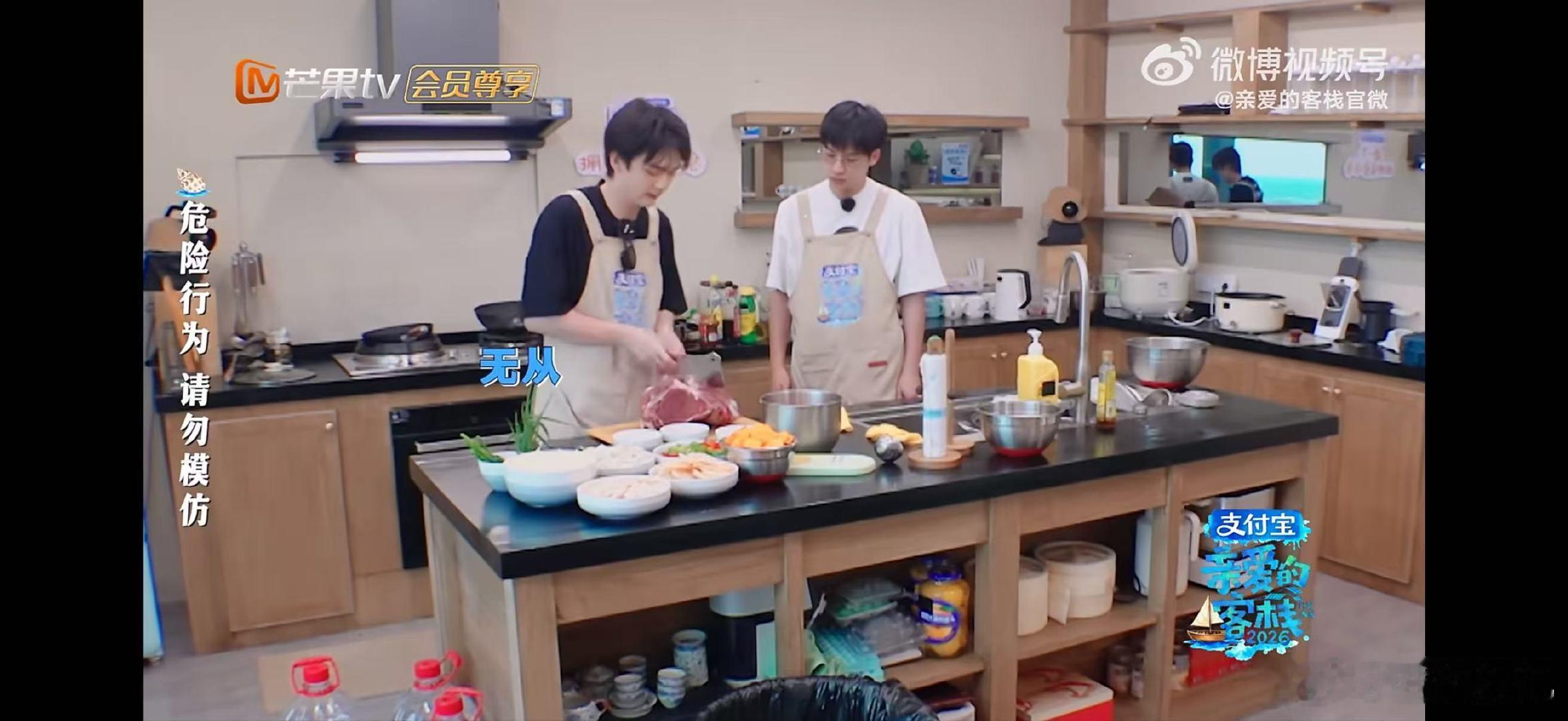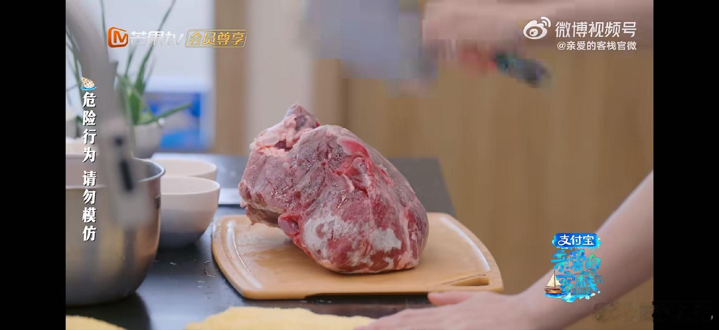 吴泽林张宸逍大战冻牛肉 亲爱的客栈《亲爱的客栈》后厨里,吴泽林拿出那块像石头一样硬的未解冻牛肉,和张宸逍商量着用“斩骨刀”切点下来。两人像两个英勇的战士,轮番挥舞着刀,可牛肉却像个“铜墙铁壁”,只留下几道浅浅的痕迹,这场大战冻牛肉,他俩算是“碰了一鼻子灰”啦!