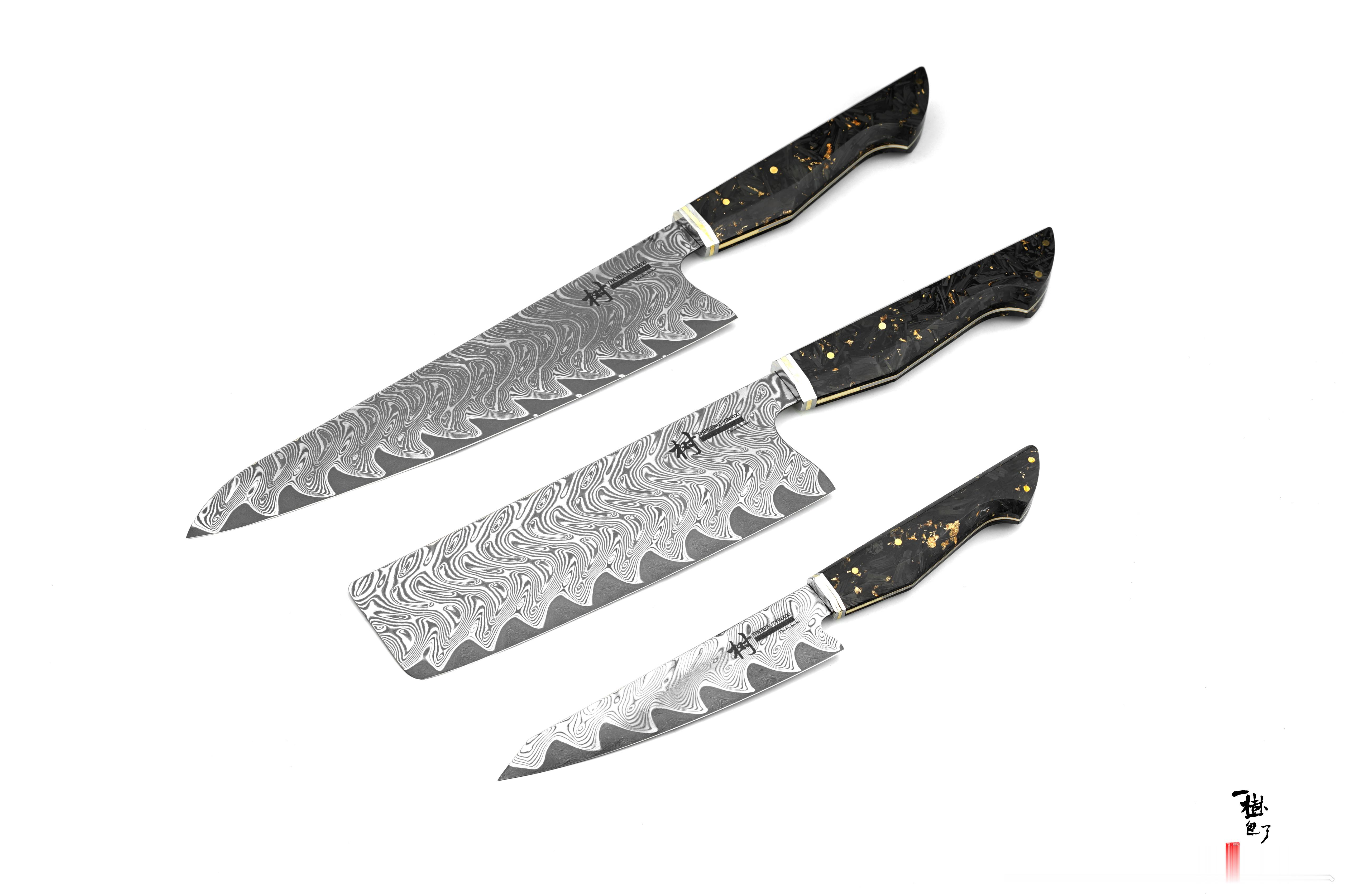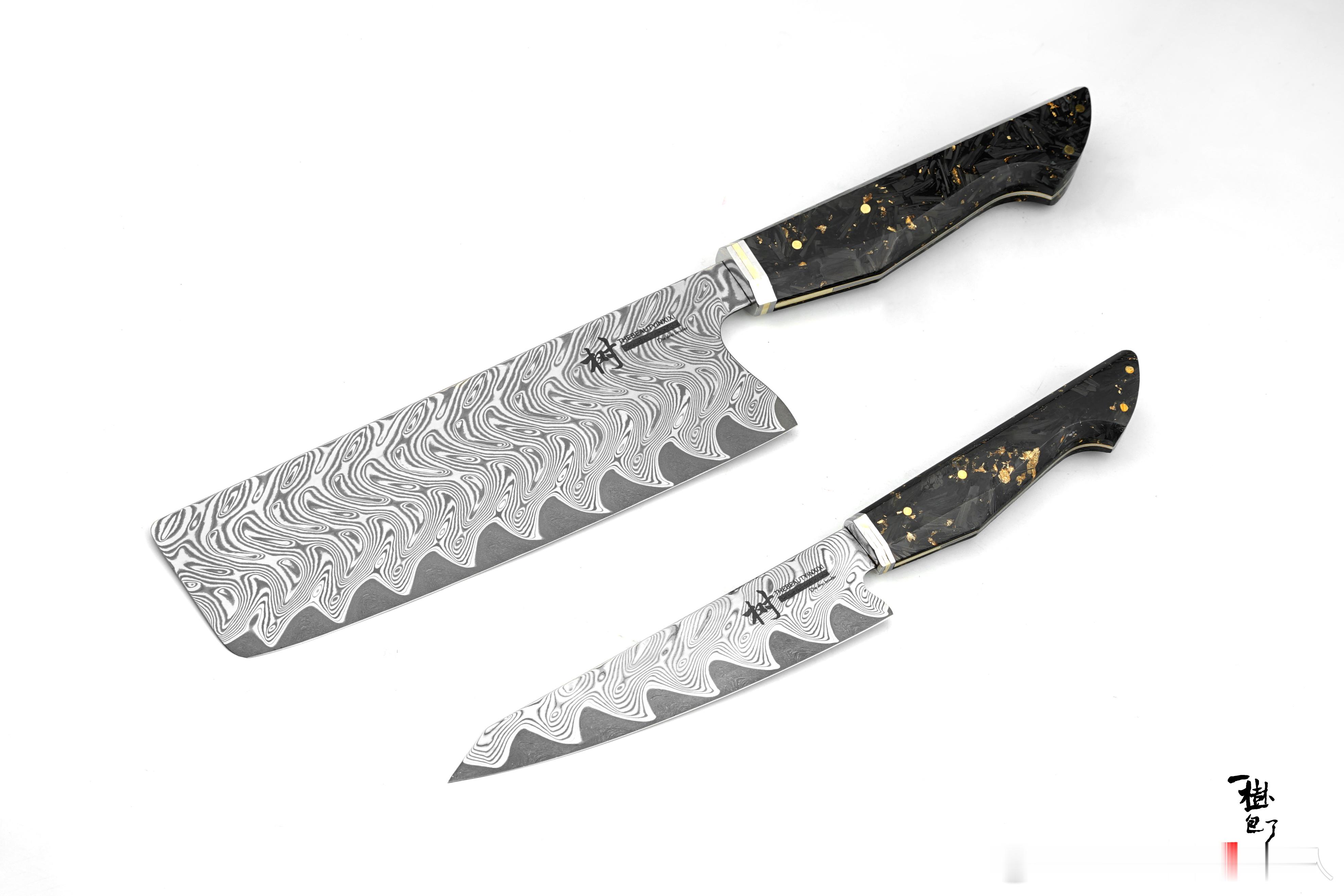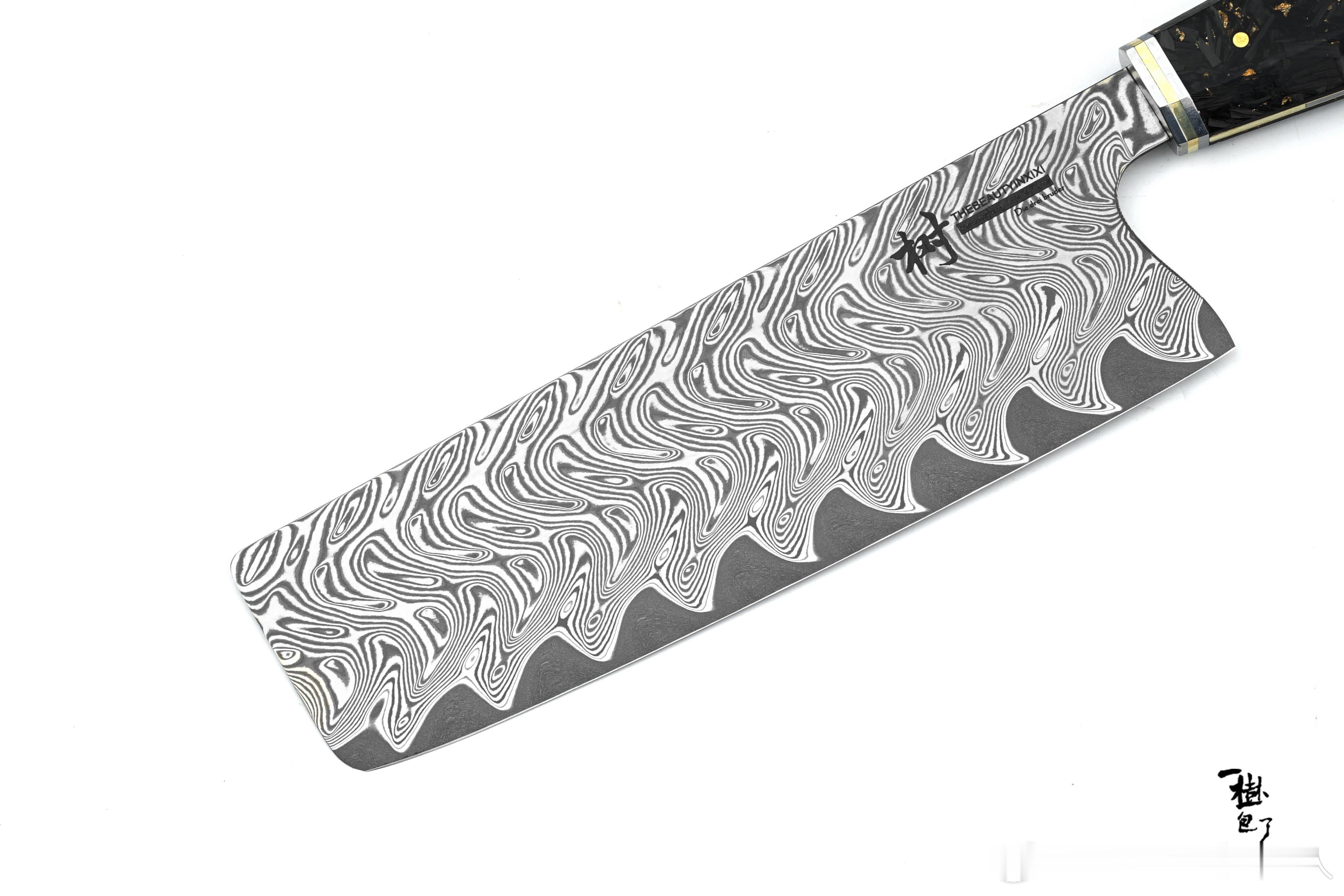 刀具控 新出的海浪大马厨刀三件套,这次的纹路很漂亮,在经典花纹的基础上增加了扭转,从刀背到刃口形成了自然清晰的海浪花纹,洒金碳纤维手柄