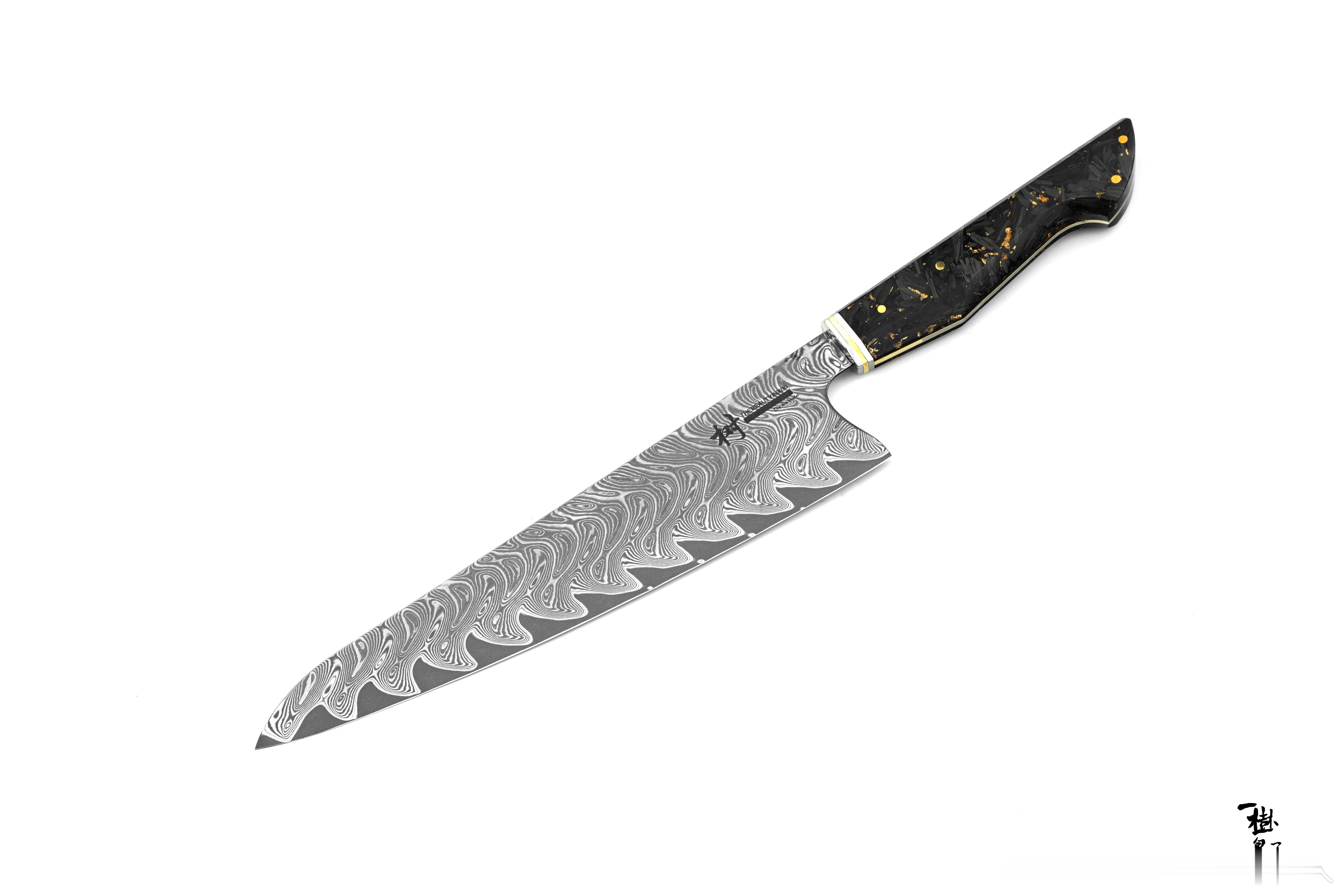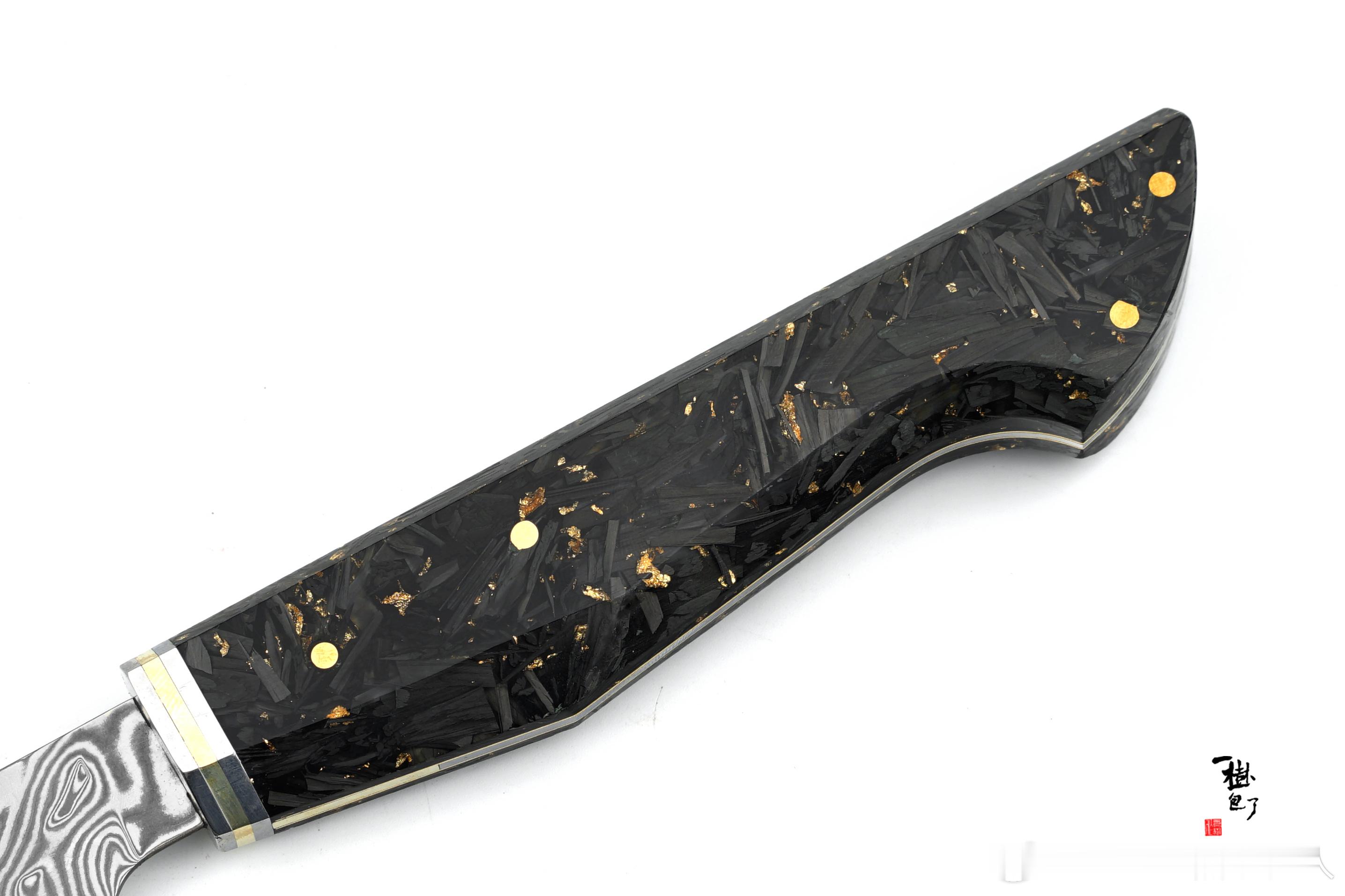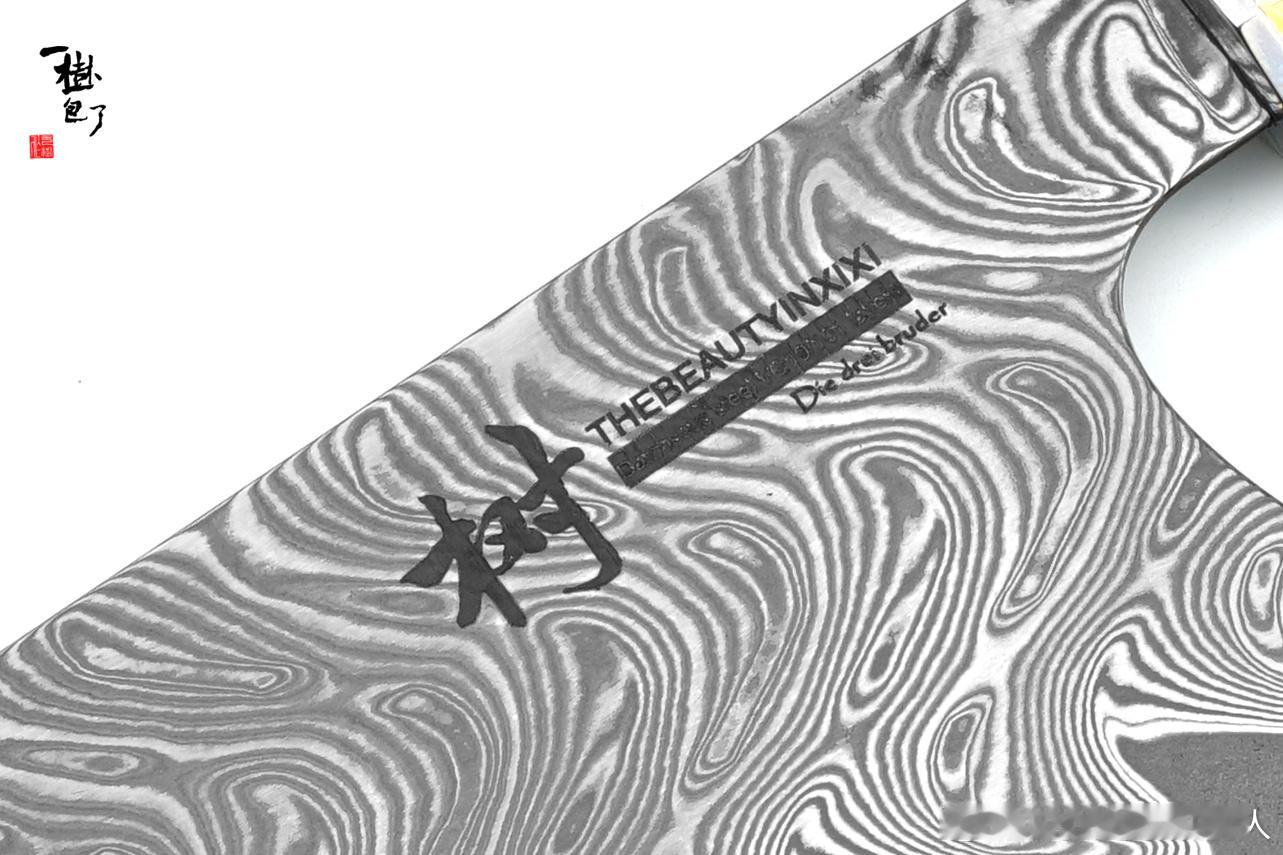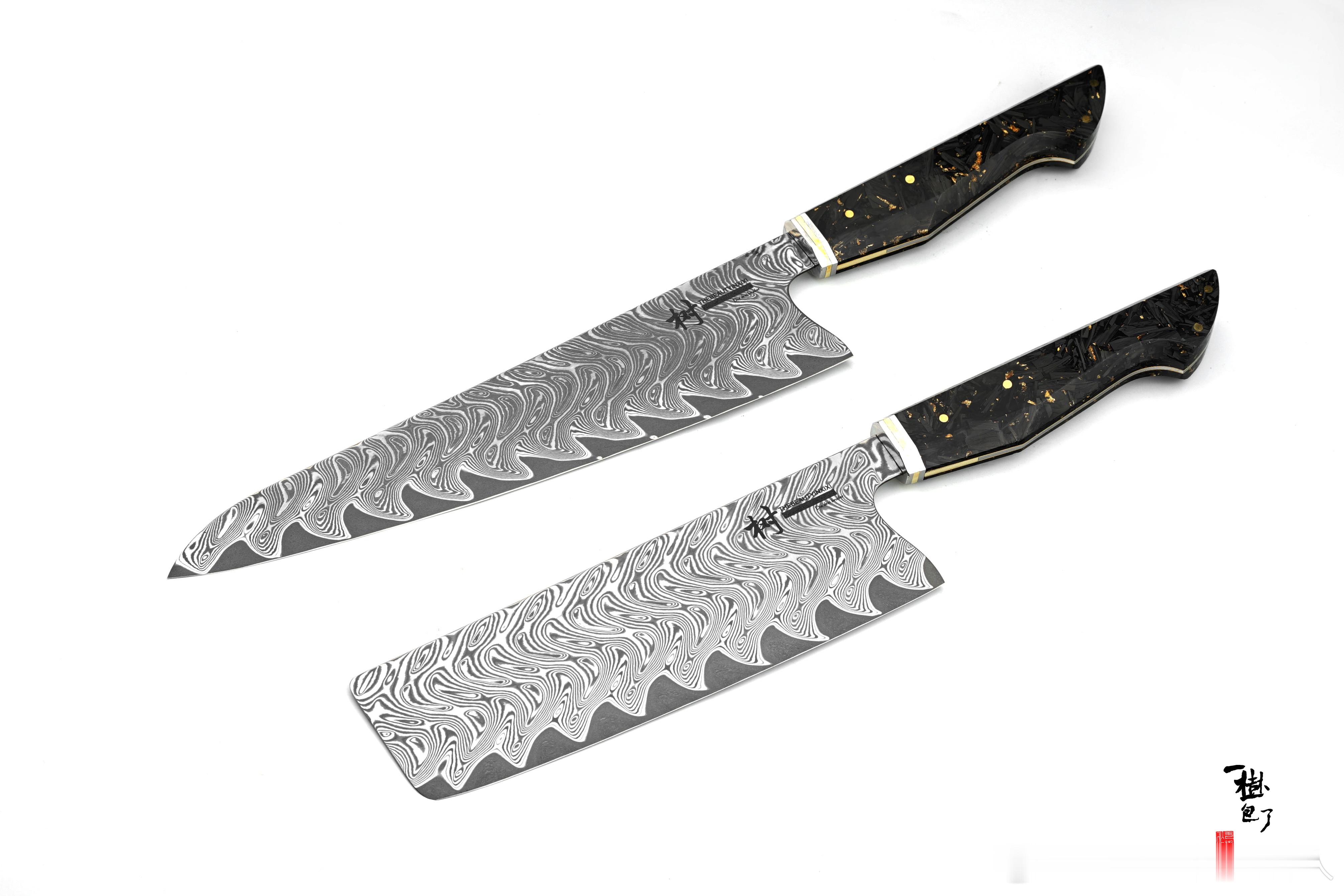 刀具控 新出的海浪大马厨刀三件套,这次的纹路很漂亮,在经典花纹的基础上增加了扭转,从刀背到刃口形成了自然清晰的海浪花纹,洒金碳纤维手柄