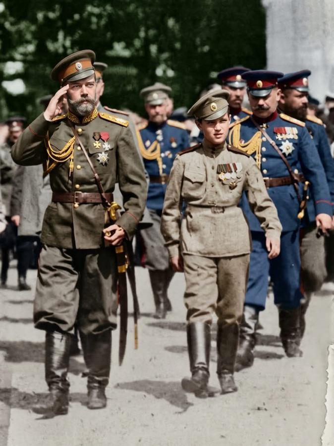 下图展示了俄国末代沙皇尼古拉二世在第一次世界大战期间与其军事幕僚一同行走的场景。与其并排行进的则是其唯一的皇子。