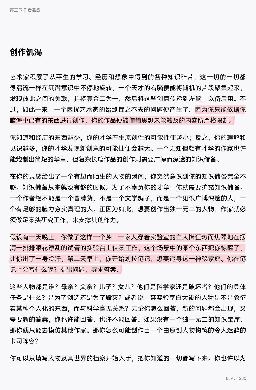 很多时候,灵感感就像下面这段话一样,开始一个莫名的梦境,但是醒来就忘了。这段话分享了如何复原、继续延续创造这个梦境,分享学习:“假设有一天晚上,你做了这样一个梦:一家人穿着实验室的白大褂狂热而焦躁地在摆满一排排眼花缭乱的试管的实验台上伏案工作。这个场景中的某个东西把你惊醒了,让你出了一身冷汗。第二天早上,你开始划拉笔记,想要追寻这一神秘家庭。你在笔记上会写什么呢?提出问题,寻求答案:
