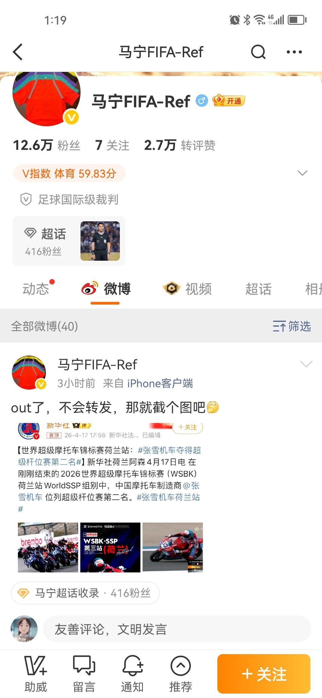 马宁关注张雪机车足球名哨马宁也来关注张雪机车了!亚冠赛后直接截图打call,还调