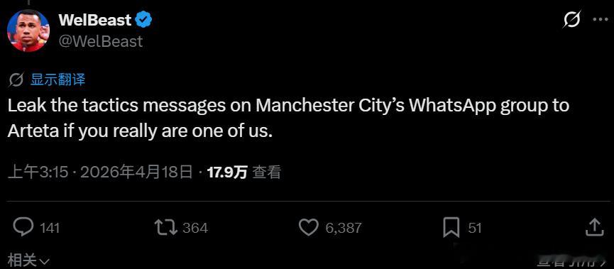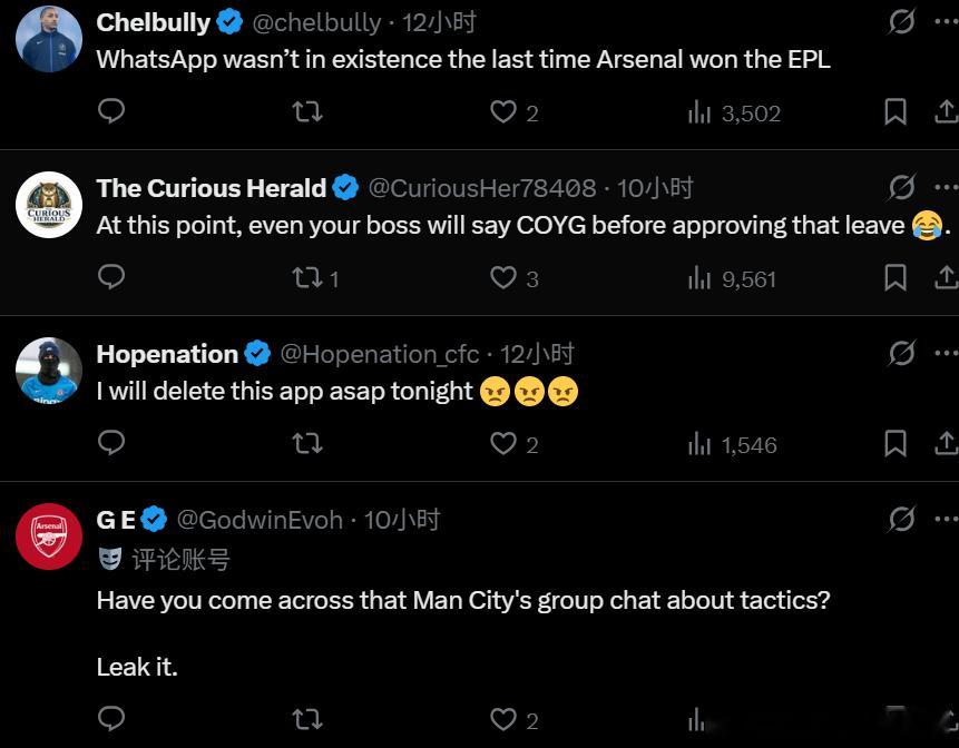 曼城球迷评论:“现在就删掉WhatsApp!”阿森纳球迷:“你要是真跟咱们一伙的,就把曼城WhatsApp群里的战术消息泄露给阿尔特塔。”