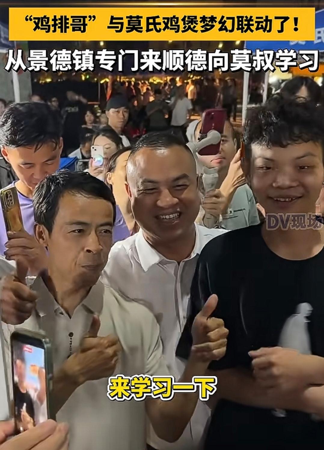 鸡排哥亲自来莫氏鸡煲梦幻联动啦!真没想到,莫氏鸡煲的爆火,把鸡排哥从景德镇吸引过来,专程过来佛山向老莫学习。这波流量算是杠杠的,给到双方,鸡排哥也算是一夜爆火,红火了一段时间,这次老莫爆火,大家在一起相互交流学习!