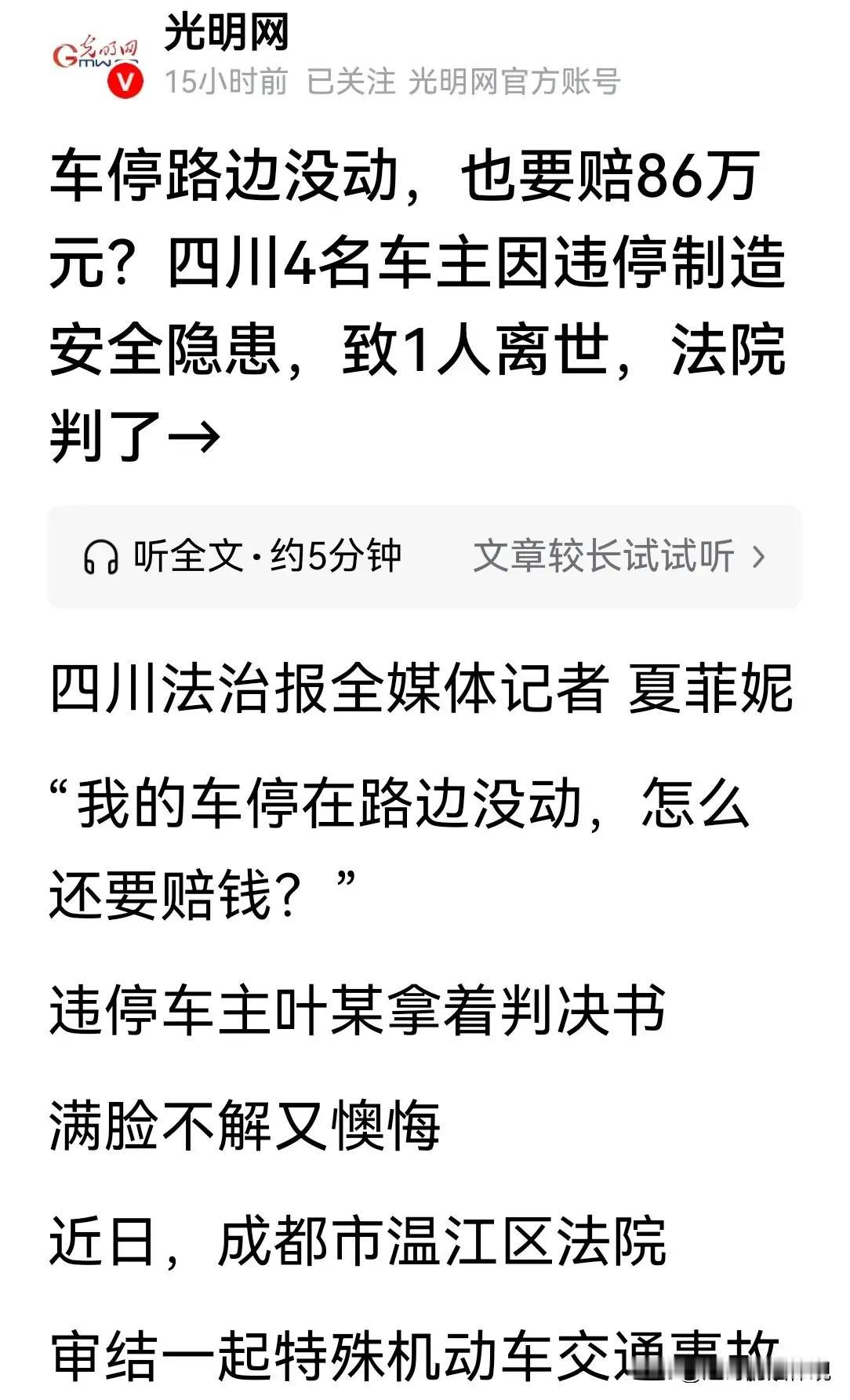 诸位朋友,今儿咱们单说成都温江那桩“无接触”的离奇车祸。这事儿,听着像“天方夜谭”,实则是一记敲碎无数人侥幸心理的“惊堂木”。4名车主把车往路边一停,人走茶凉,谁曾想这静止的“铁疙瘩”,竟成了夺命的“路障”。摩托车为避让窜出的狗,在违停车辆的视线盲区里瞬间失控,后座妻子重重摔地,当场殒命。家属索赔124万,车主喊冤:“我车都没动,凭啥赔钱?”可法院一锤定音:赔!86万!这哪是停车?分明是在生命的道路上“埋雷”。