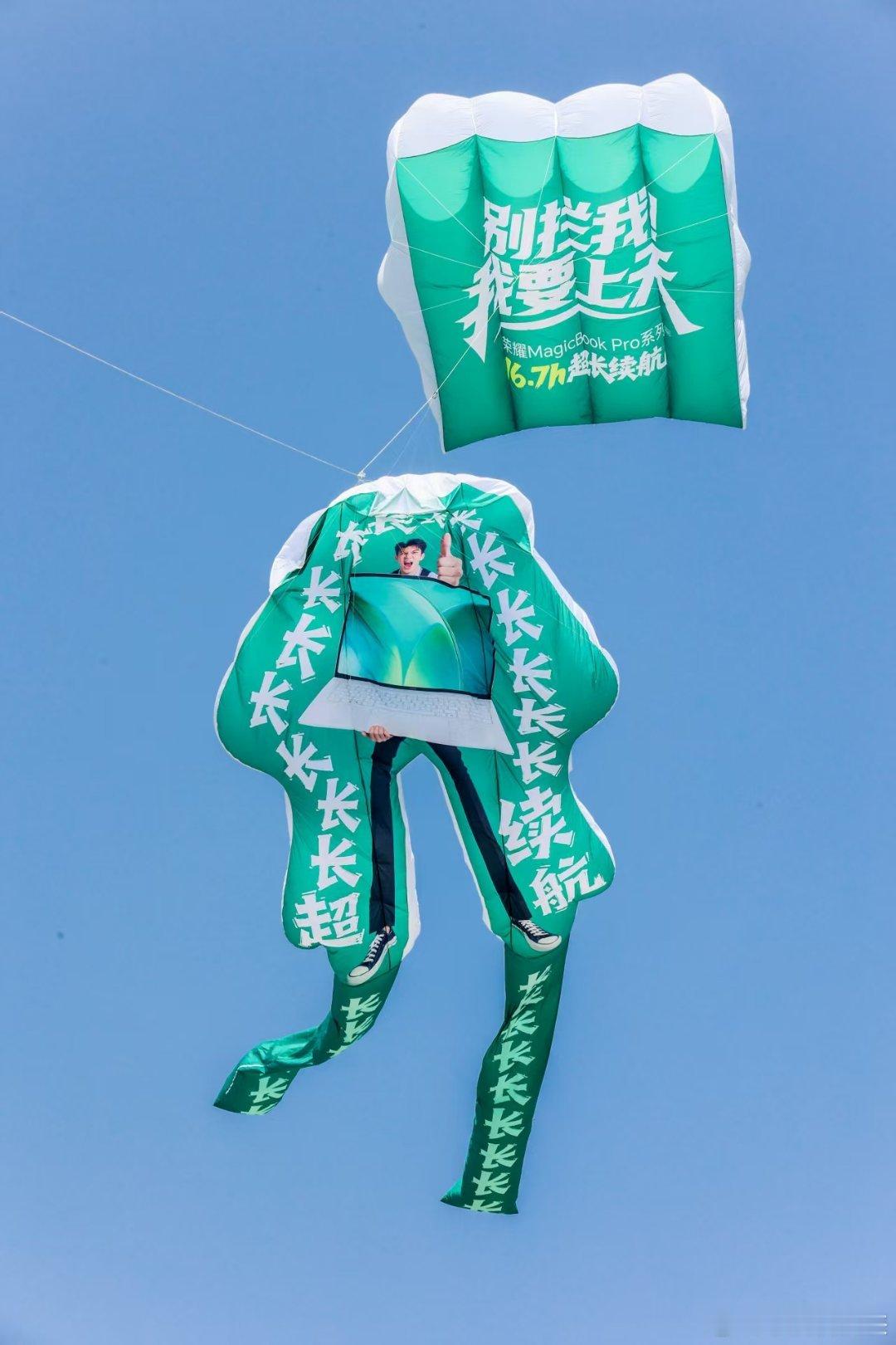 荣耀借势潍坊风筝节可以说是创意十足,以超长长长长腿风筝、男大学生飞天趣味创意,具象化传递 WIN 游戏本东风涡轮散热系统、MagicBook Pro 16.7h 超长续航核心优势,年轻化氛围感拉满!潍坊风筝节万物皆可乘东风飞天风筝节没有放不上天的东西荣耀笔记本荣耀win游戏本