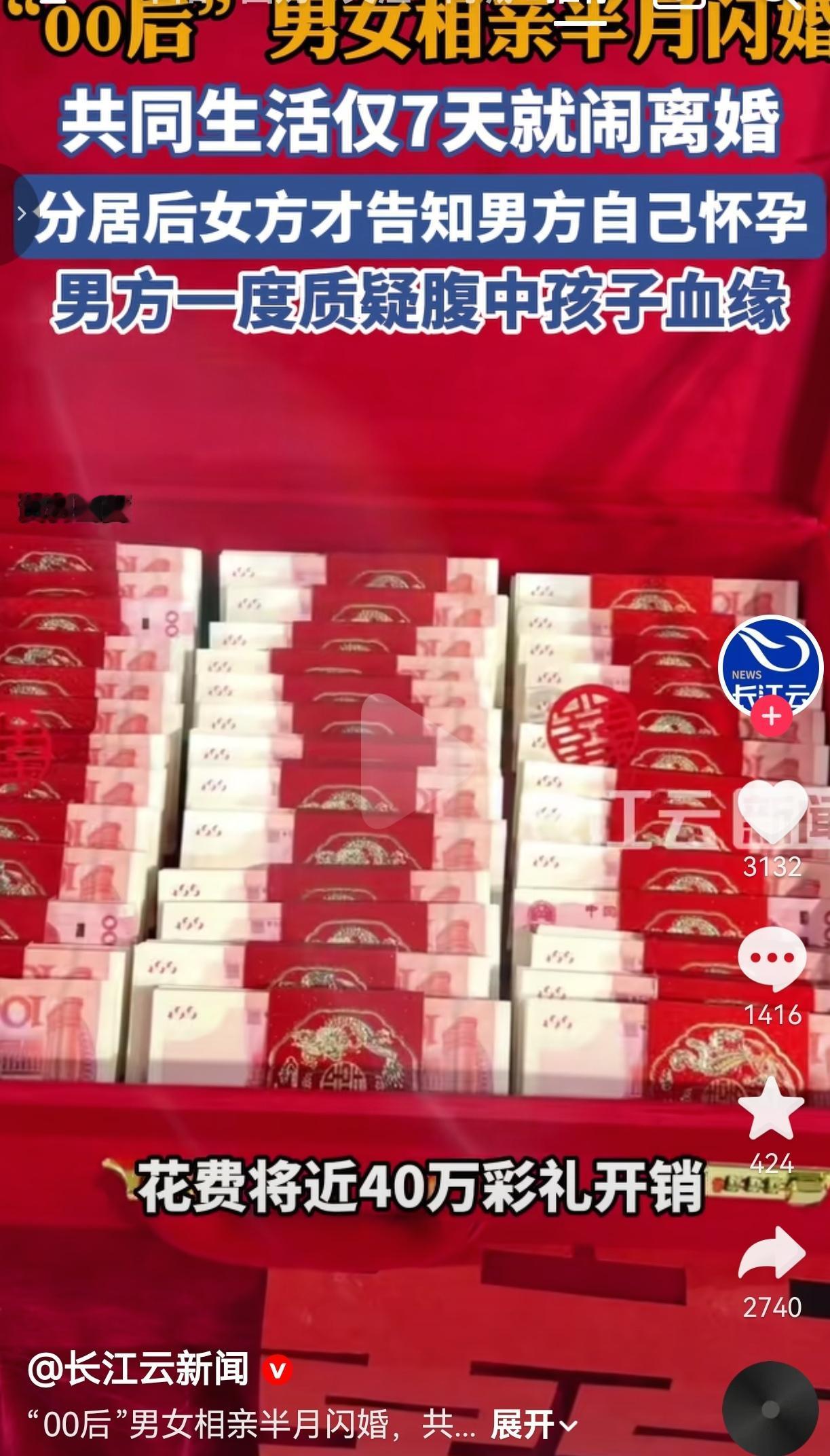 网友看到后评论说:“男方家这40万是大风刮来的?半个月领证,7天离婚,合着这姑娘是来‘骗彩礼’的?”