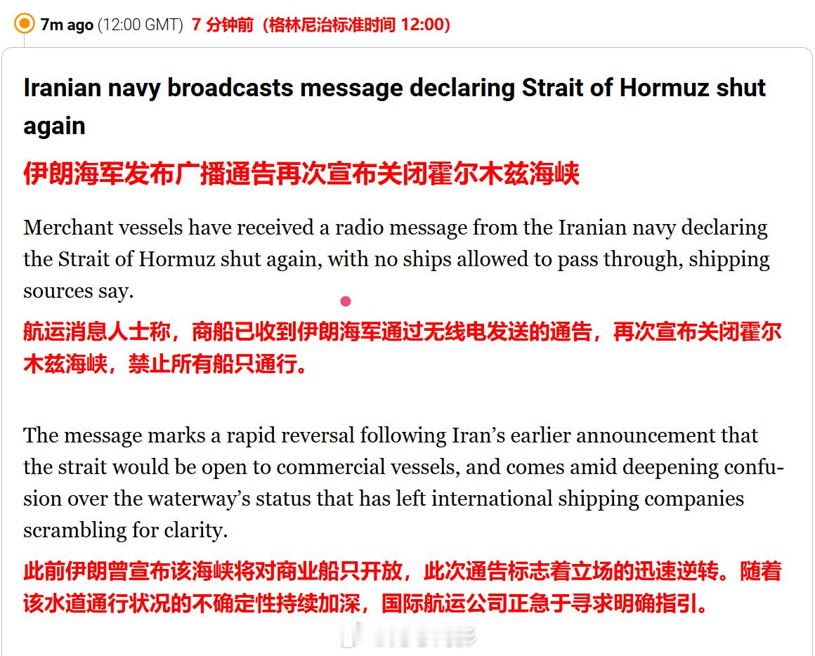 根据半岛电视台的报道,伊朗以美国“失信”为由,再次对霍尔木兹海峡进行封锁。伊朗之前还把海峡对商业船只开放,现在也又变成禁止所有船只通行了。这距离特朗普发帖称“伊朗已同意永不再次封锁霍尔木兹海峡”才过去多久?