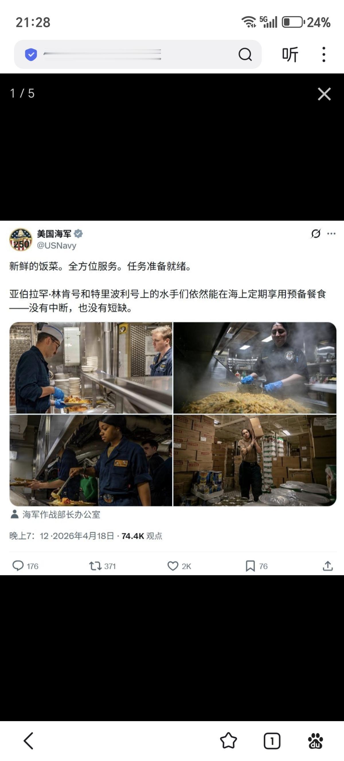 美军舰上都是罐头——美国海军发布照片,嘴硬地表示林肯号(CVN-72)和的黎波里(LHA-7)没有出现食物中断和短缺。
