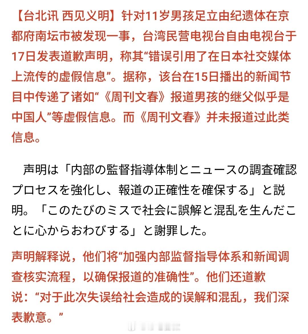 因在日本京都男童遗体遗弃事件中传播“受害者继父是大陆人”的虚假信息,在被日本抓包后,台湾电视台道歉。民视在15日播出的新闻节目中,错误地传播了“(受害者)男童的继父似乎是大陆人,据《周刊文春》报道”等信息。但该周刊并未报道过此类内容。本来嘴硬的,结果被日本媒体发现了,只好舔着脸出来道歉了