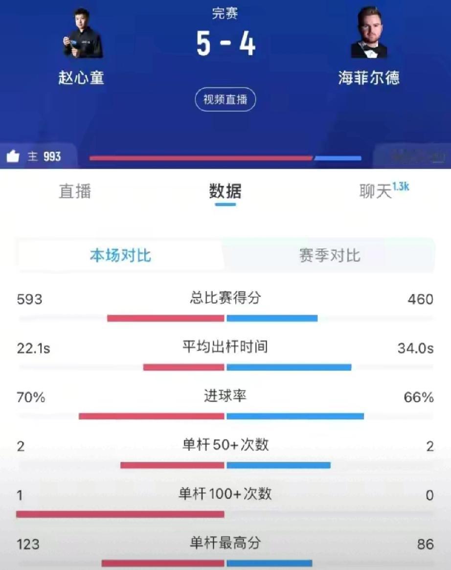 4月18日晚,斯诺克世锦赛正赛首日,赵心童在第一阶段,以5比4领先海菲尔德。