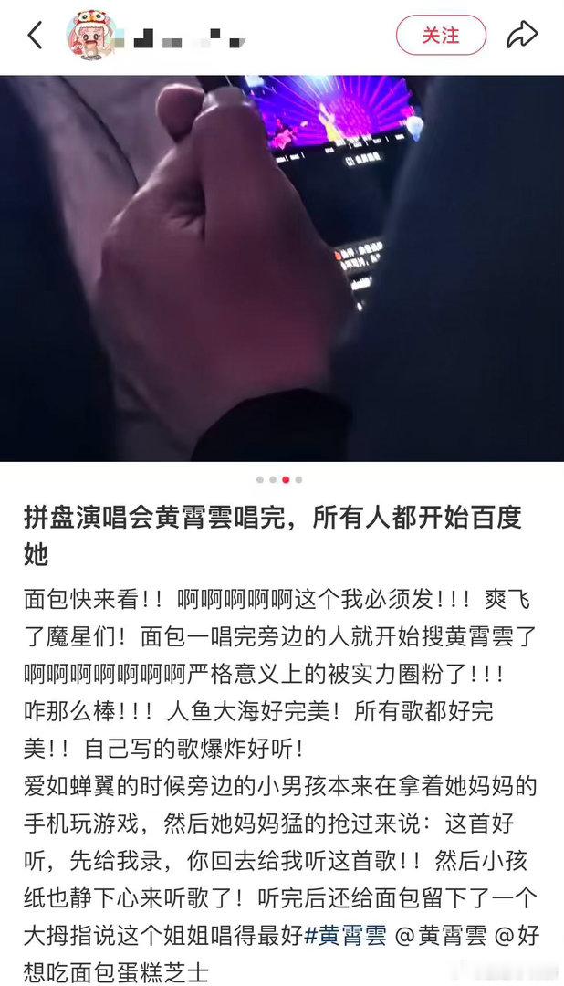 黄霄雲全开麦有效拼盘黄霄雲有效拼盘的含金量 拼盘演出通常很难留下印象,因为观众注意力是分散的。但黄霄雲每次都能让人记住,因为她的声音辨识度太高了。一开口就知道是她。