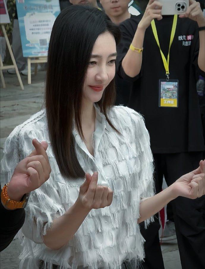 王丽坤上身搭配了一件特别漂亮的流苏衬衣,下身穿灰色的牛仔裙,凸显出了满满的清丽时尚范儿。