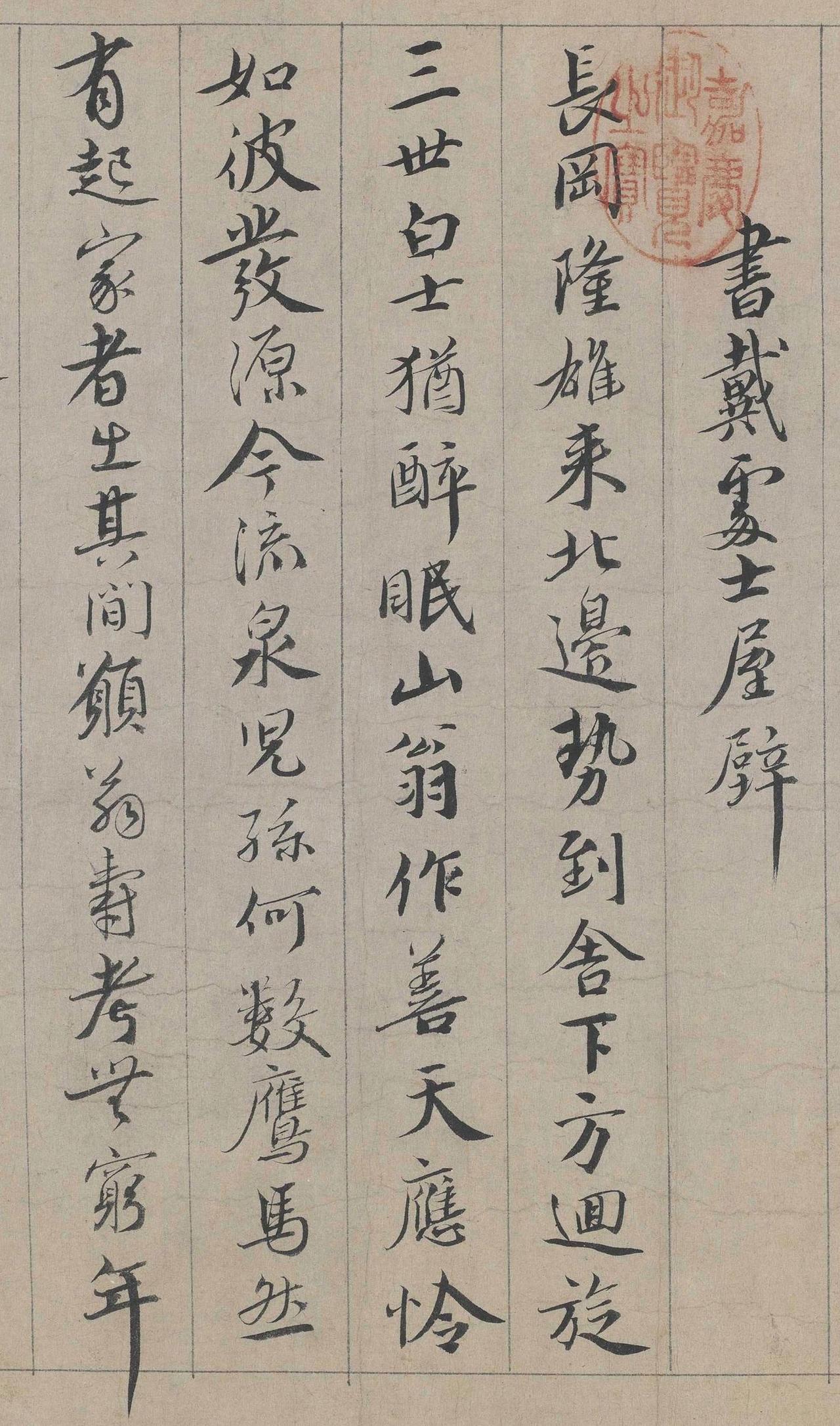 整卷里头收了十一首诗,真书、行书、草书来回换着写。真书占了大概三分之一,剩下的是行草。三种体换来换去,一点也不觉得生硬,整篇气是通着的。