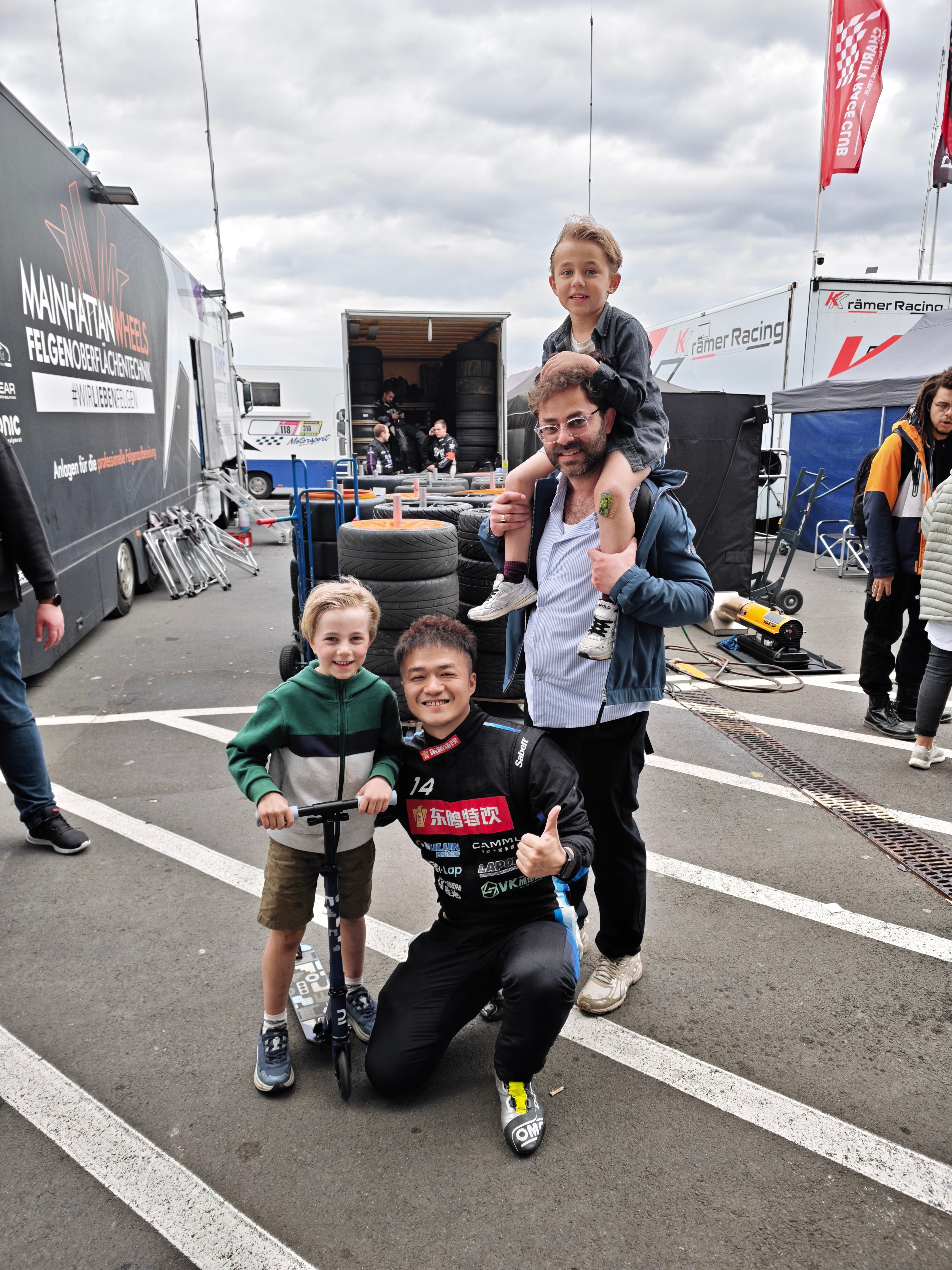 今天马上要发车了,车队把车停外面了,我们紧急贴贴纸,然后吸引了一大波观众驻足围观。氛围超级好。我觉得来纽北比赛,成绩差点可以慢慢提高,但这个氛围真的有空可以来体验一下,超级好。