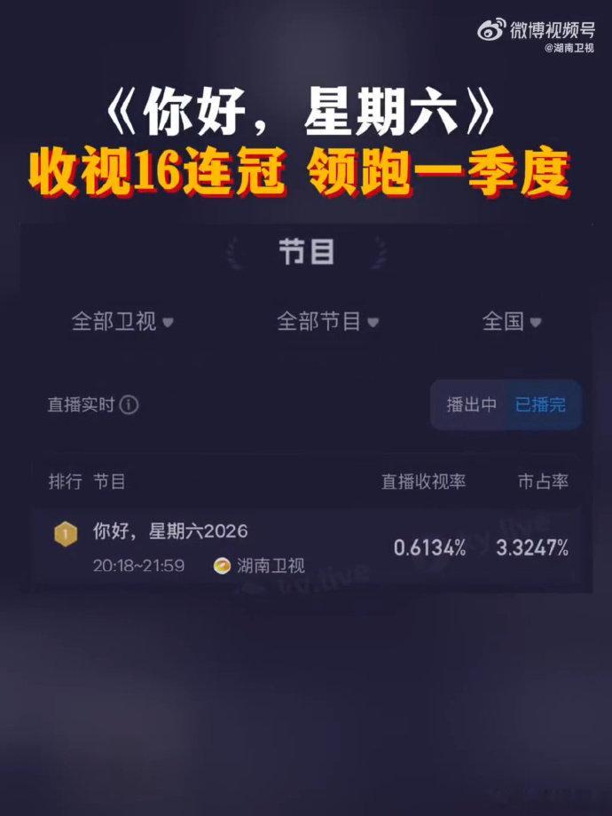 hi6收视领跑Q1 收视数据一路领跑,口碑热度双丰收,十六连冠彰显超强国民度!你好星期六收视16连冠