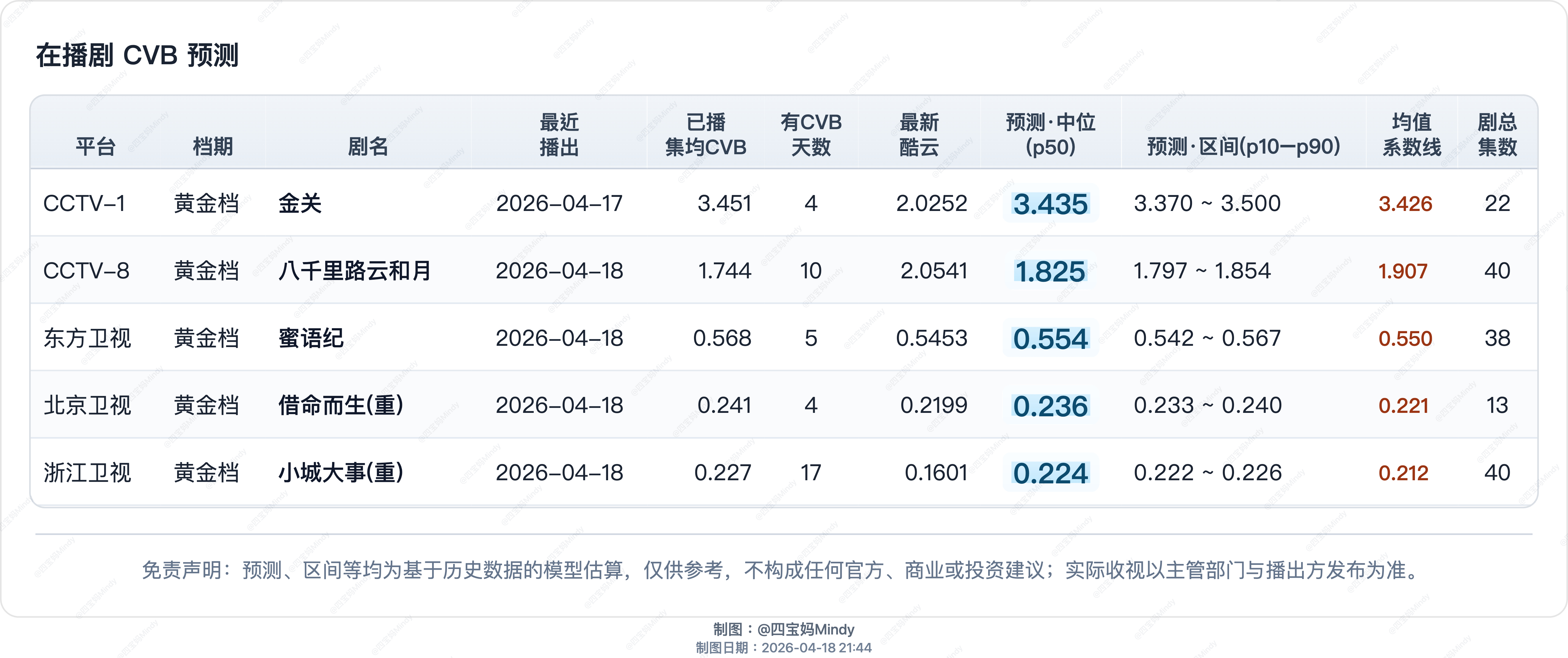 4.18 CVB预测在播剧:金关、八千里路云和月、蜜语纪、冰湖重生