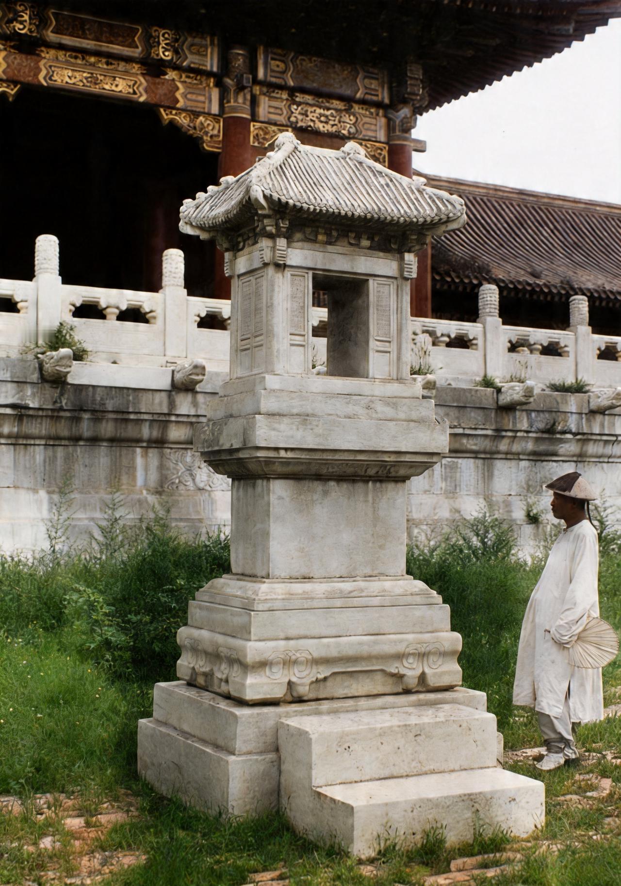 这是晚清一名太监手持蒲扇站在太和门前的嘉量前仔细观赏。虽然,他已经在皇宫中当差多年,但他从来没有像现在一样细细观赏面前的嘉量。