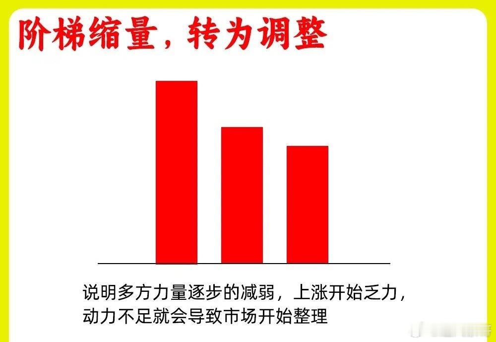 1.阶梯缩量,转为调整成交量出现阶梯式的缩量,一根比一根要小,说明动力出现明显不足,买盘资金开始变少,属于一个调整状态。一般上涨趋势的中继就会出现这种走势