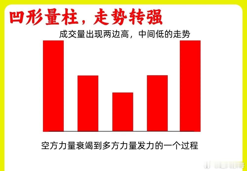 5.凹形量柱,走势转强成交量出现放量到缩量再到放量,就形成一个凹字量,两边的量柱大,中间的小,这是主力试盘,在洗盘,在拉升的一个过程。市场情绪开始变强