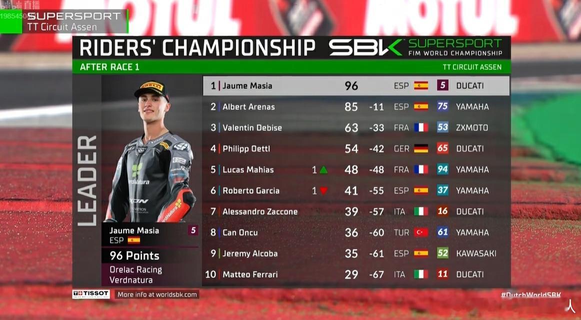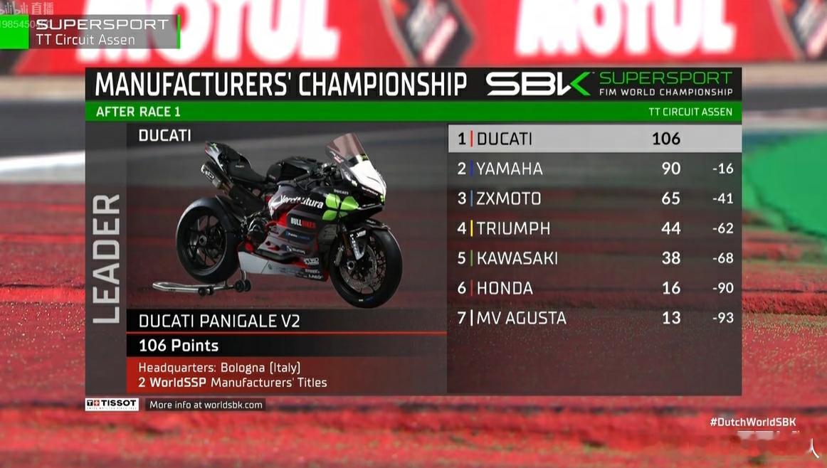 2026世界超级摩托车锦标赛荷兰站SSP组别正赛第1回合,张雪机车53号车手德比斯最终获得第四名的成绩,拿到13积分,在车手积分榜上落后第一名马西亚33分。张雪机车65分,在车队积分榜上也是排名第三。
