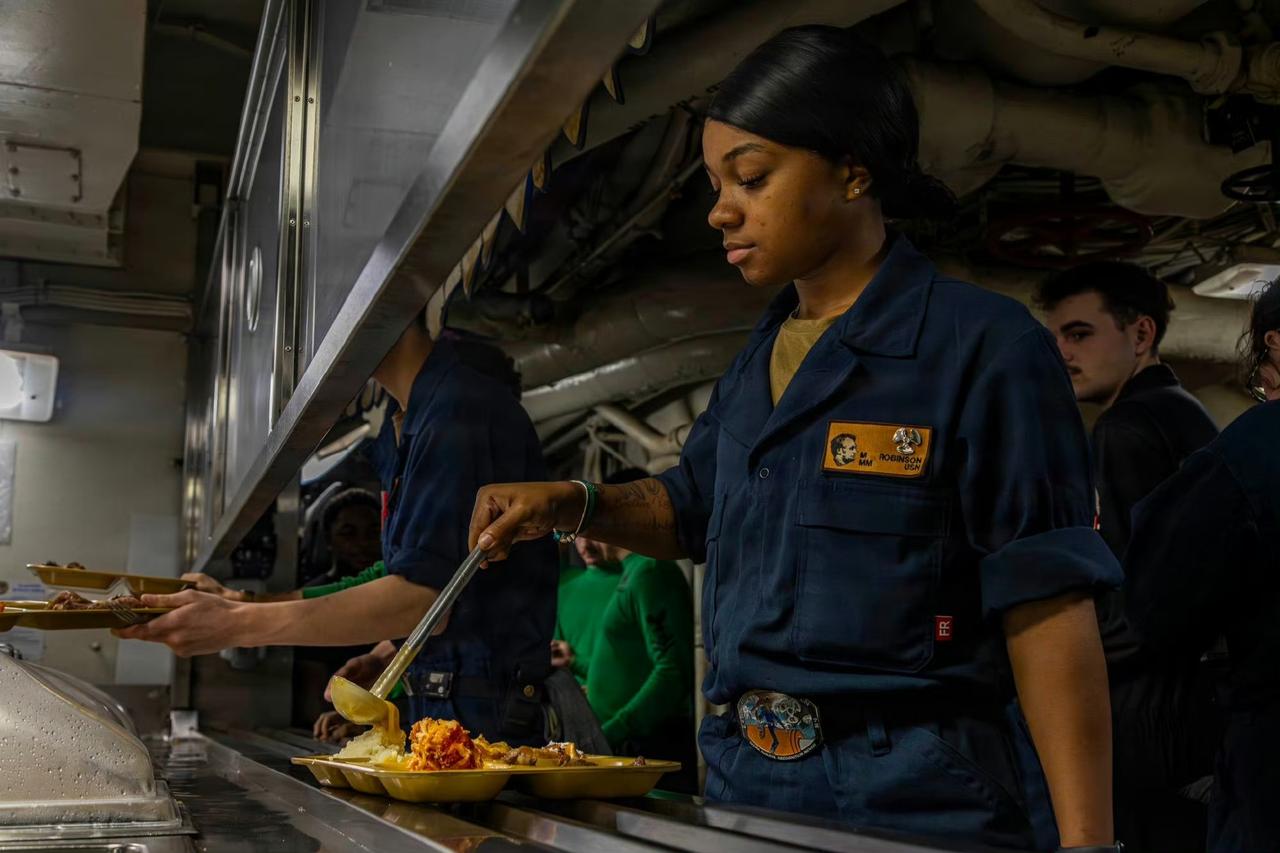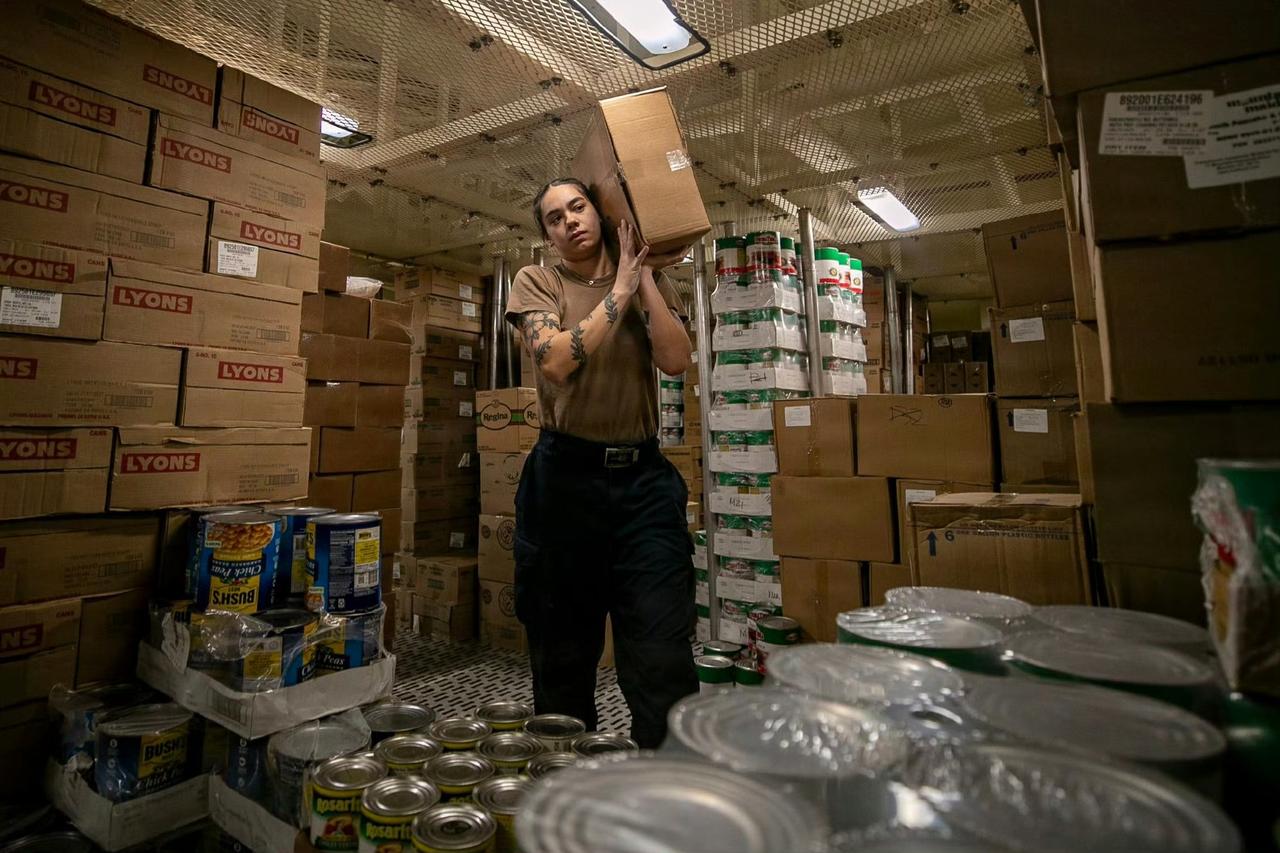针对林肯号上伙食差的讨论,美军发布了一组照片来回应,不但放出餐厅打饭的照片,也放出了物资仓库的照片。意思就是美军粮食充足。