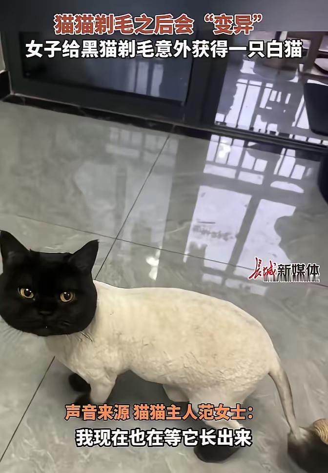 近日浙江杭州,女子嫌家里黑猫掉毛太严重,就把黑猫身上的毛给剃了,没想到的是,剃完毛之后黑猫消失了,竟然变成了一只白猫,网友:刷新认知了,以为里边也是黑的呢。