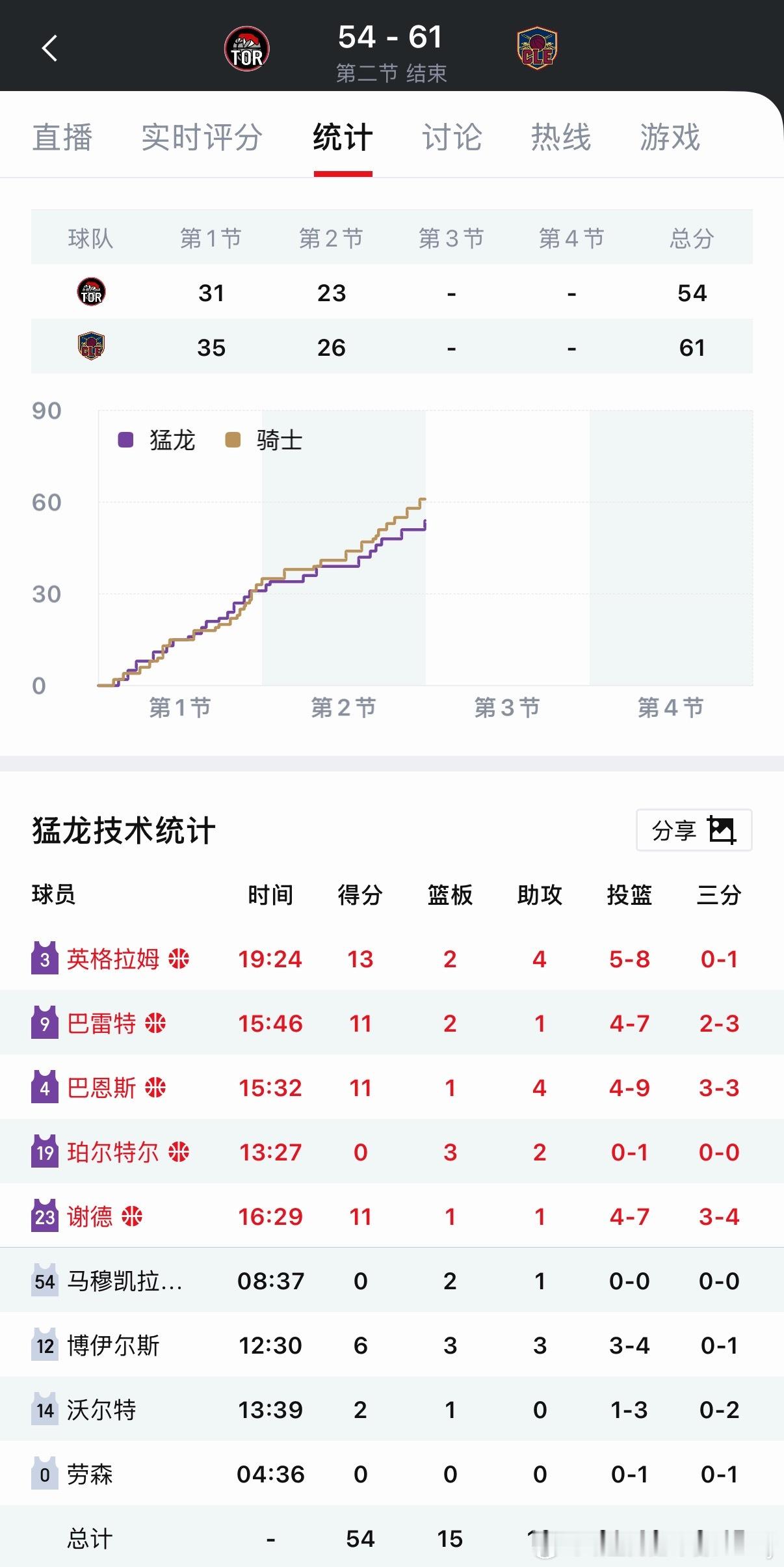 半场结束!骑士61-54领先7分!