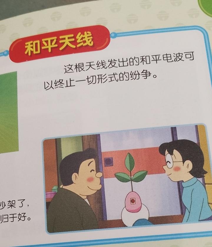 80后,90后小时候都是看日本动画片的,叮当猫有很多法宝的,例如儿童电话,现在是儿童手表,有定位功能,间谍卫星,和平天线,最近日本想挑动战争,很多间谍以各种各样的身份过来潜伏,如果有和平天线就好了,让日本的激进派接受和平电波,恢复和平相处的想法,在和平的气氛中生活。但可惜这个法宝估计没用!