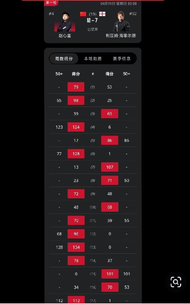 全场比赛,赵心童共打出3杆破百(123分/128分/112分)和6杆50+ (65分/77分/68分)。