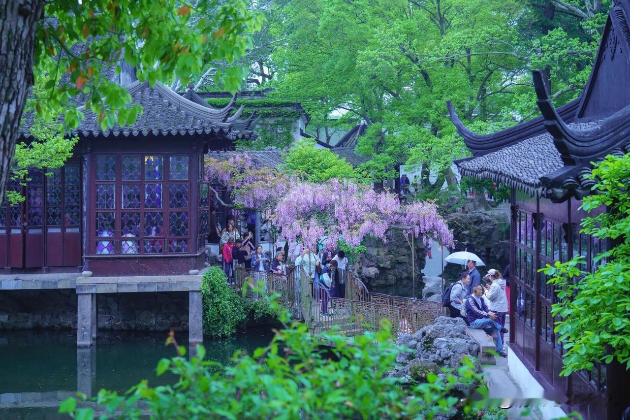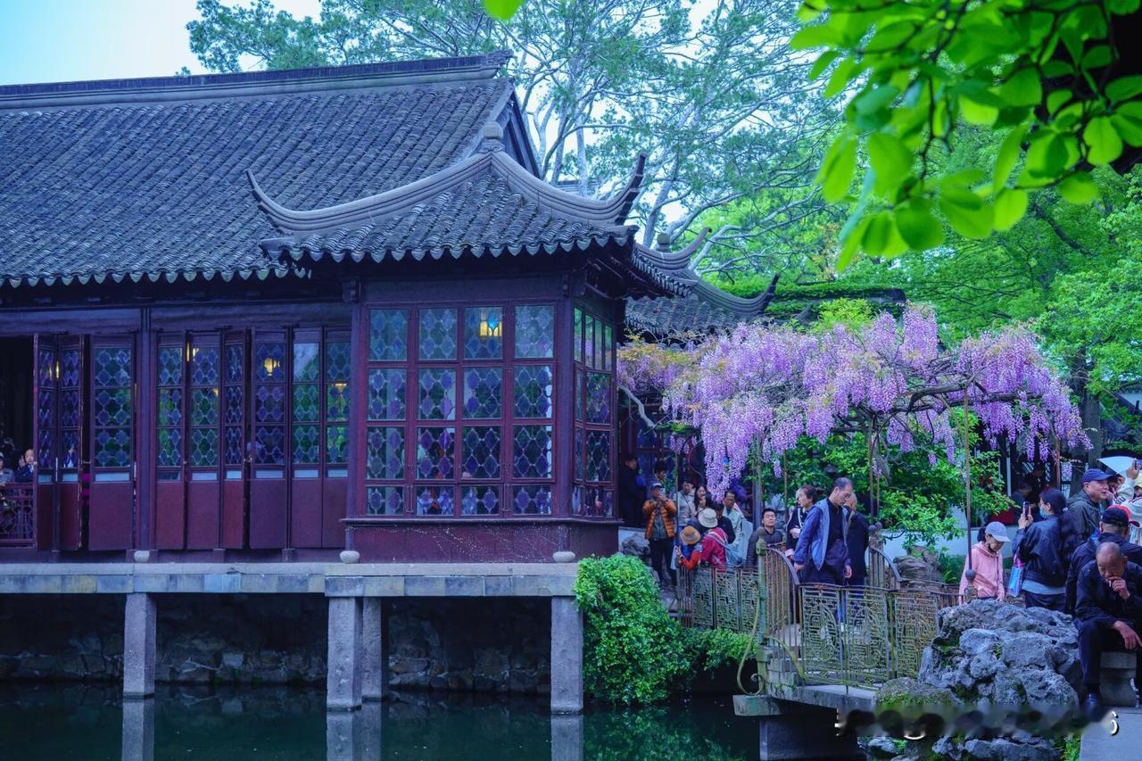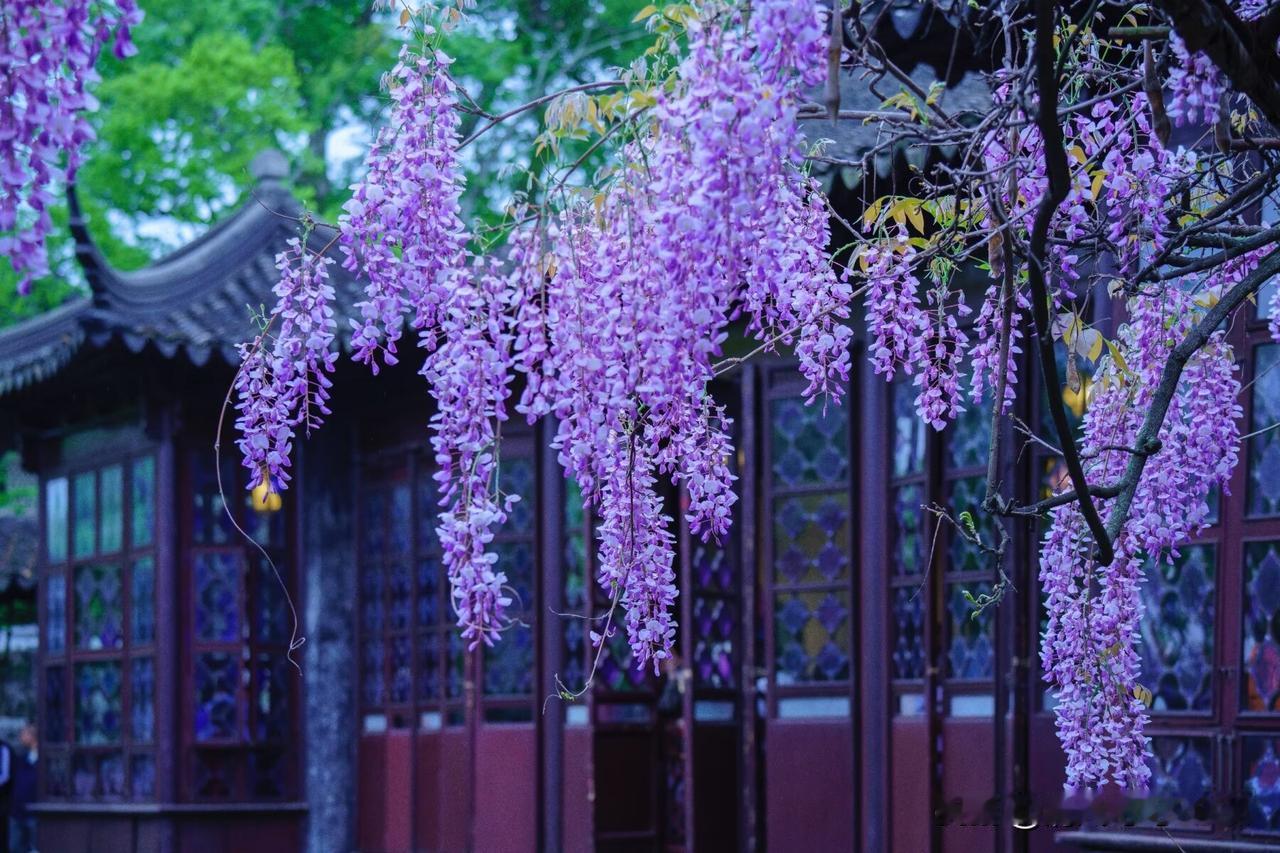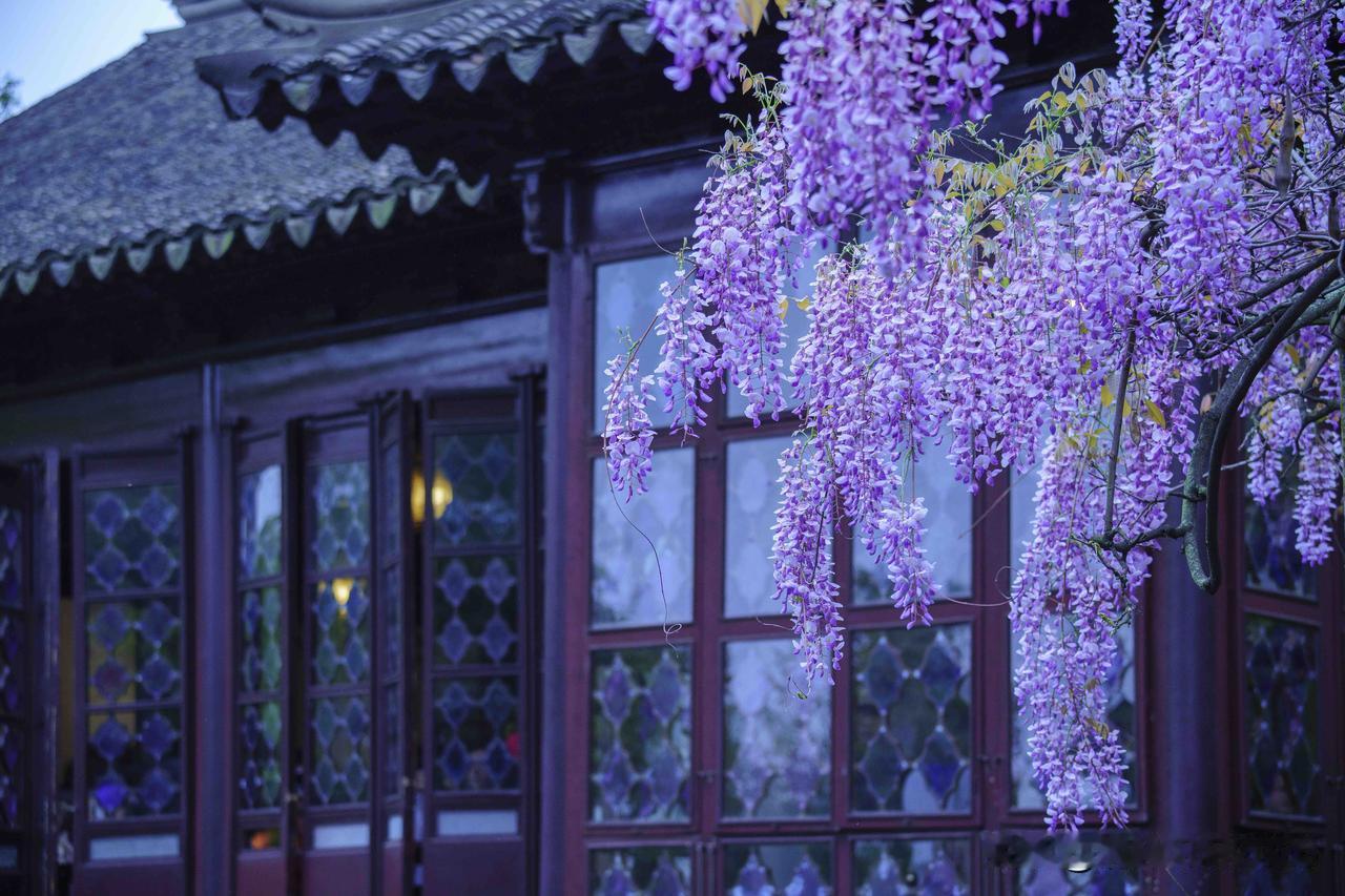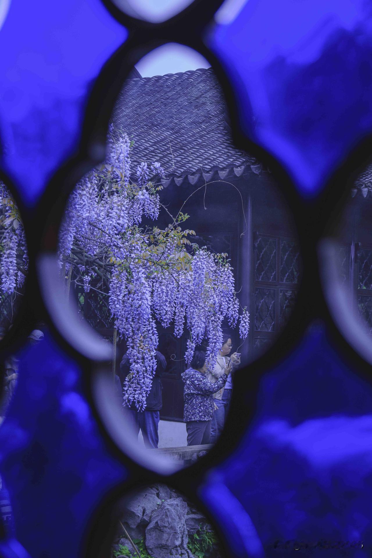 卅六鸳鸯馆玲珑精巧,蓝紫琉璃窗光影流转。先隔着玻璃,将窗外紫藤的温柔紫韵,定格成最动人的风景;再走近廊下,看紫藤垂落如云,柔蔓缠绕廊柱,花瓣轻覆石栏,感受繁花满架的鲜活;最后再登高远眺,将蓝窗、古馆、紫藤与整个园景全貌,一并收入镜头。三种视角,三种意境与心境,古建的雅致与繁花的烂漫相映成趣,蓝窗映花影,古藤绕回廊,刚柔相济,动静相宜。建筑之精、花木之美、意境之幽,在此处融为一体。