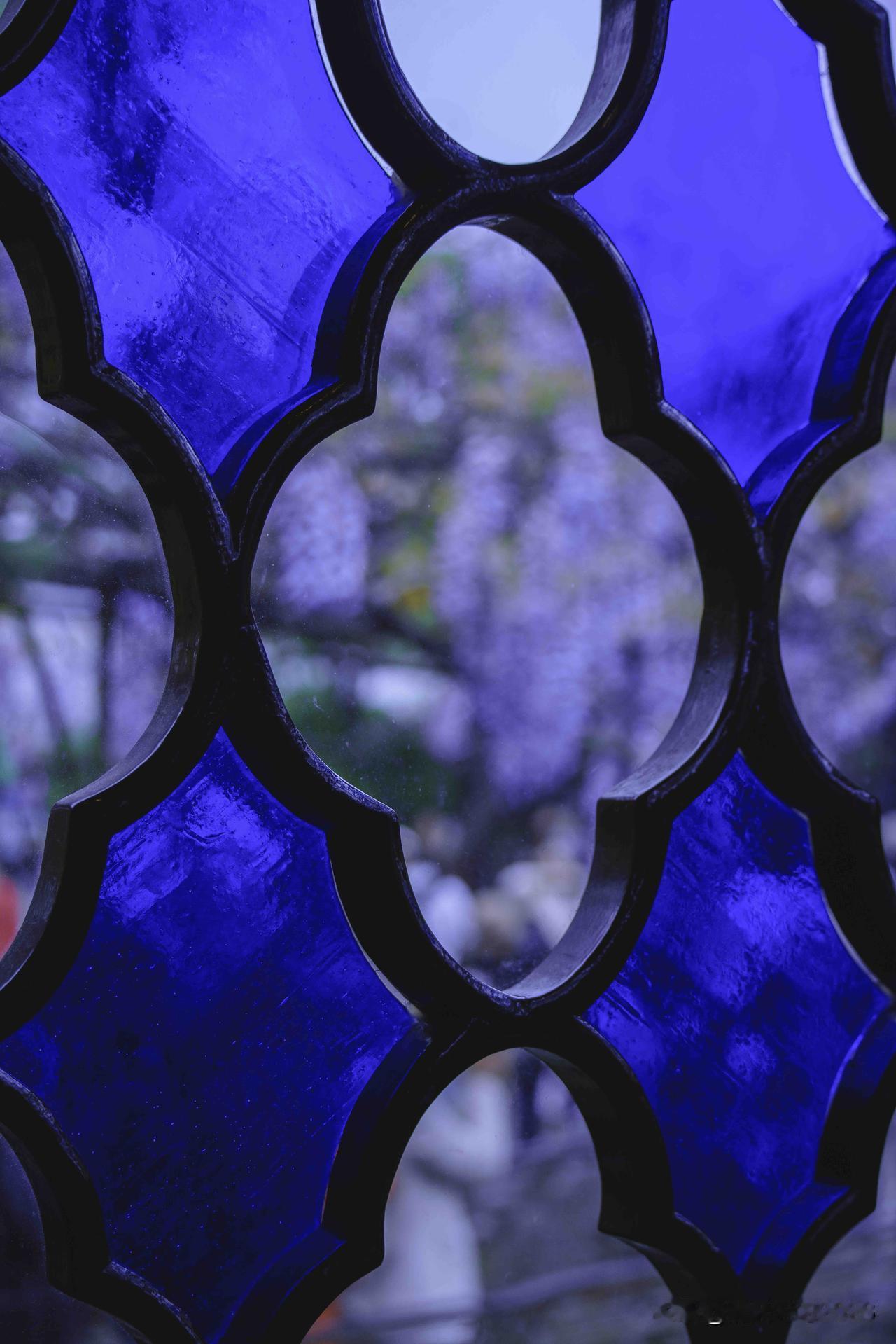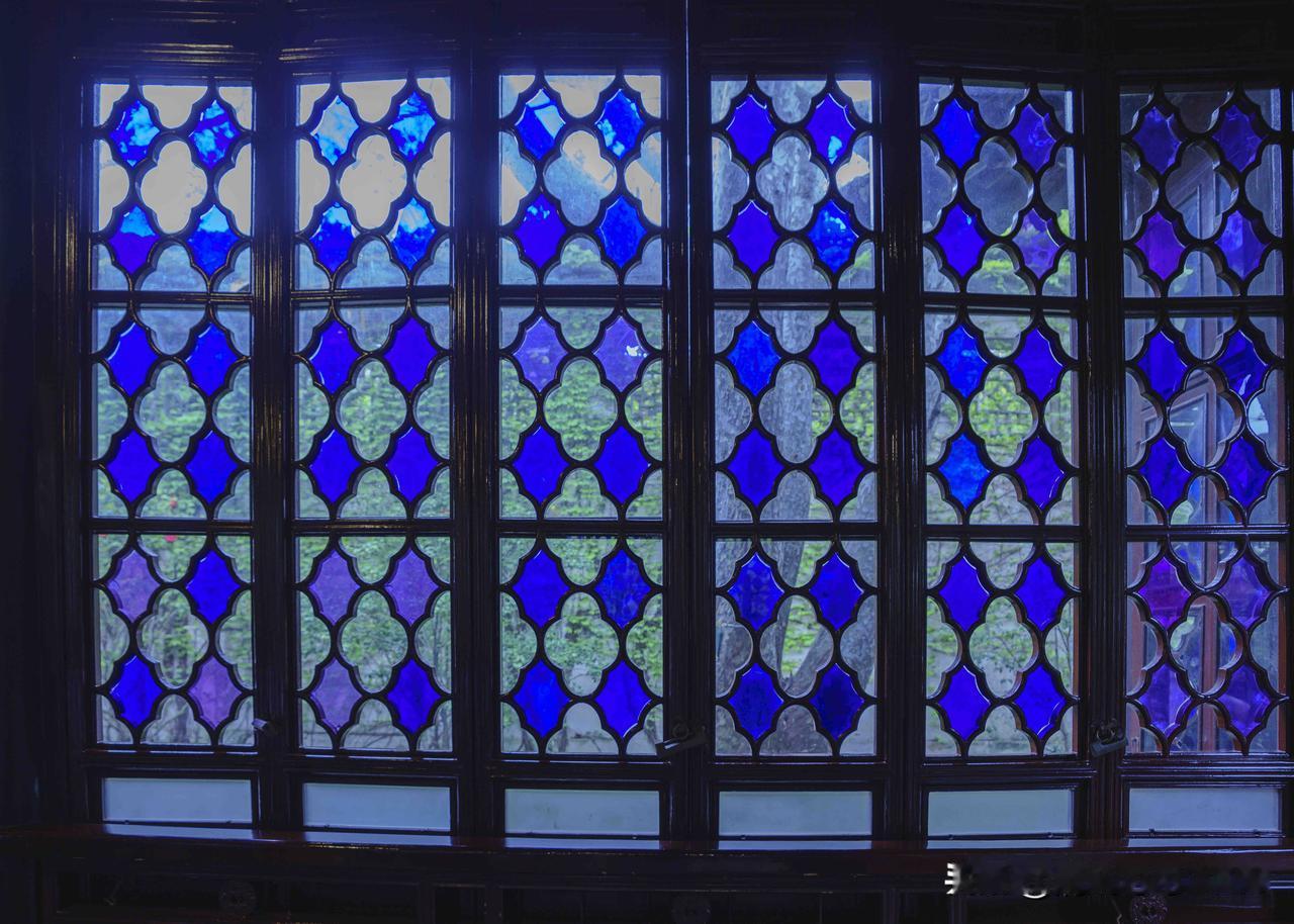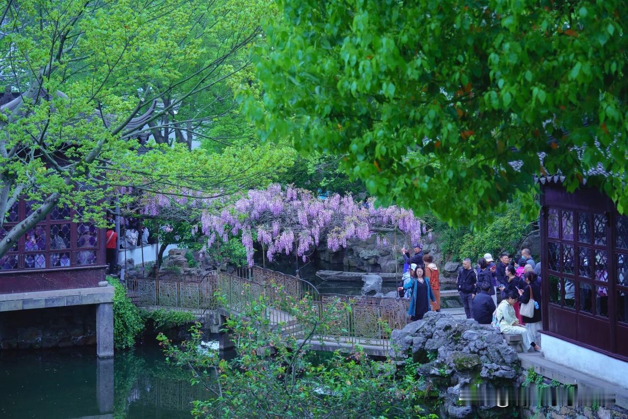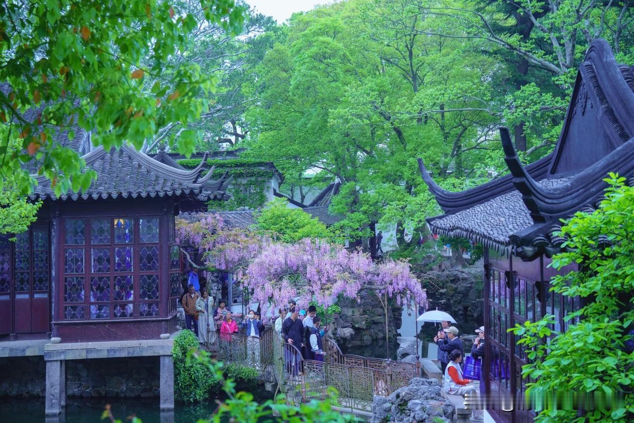 卅六鸳鸯馆玲珑精巧,蓝紫琉璃窗光影流转。先隔着玻璃,将窗外紫藤的温柔紫韵,定格成最动人的风景;再走近廊下,看紫藤垂落如云,柔蔓缠绕廊柱,花瓣轻覆石栏,感受繁花满架的鲜活;最后再登高远眺,将蓝窗、古馆、紫藤与整个园景全貌,一并收入镜头。三种视角,三种意境与心境,古建的雅致与繁花的烂漫相映成趣,蓝窗映花影,古藤绕回廊,刚柔相济,动静相宜。建筑之精、花木之美、意境之幽,在此处融为一体。