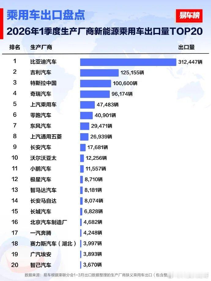 看完了这几张2026年一季度的出口榜单,简单聊聊哈:一个字,猛! 中国车出海真是