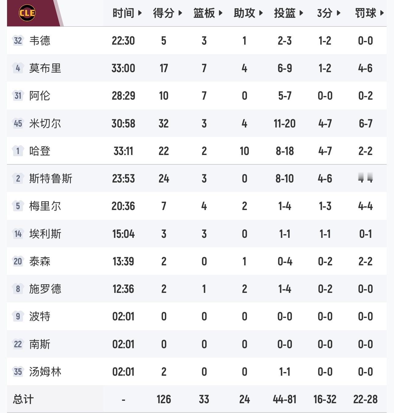 米切尔32分,哈登22+10,骑士126-113猛龙,取得系列赛开门红。
