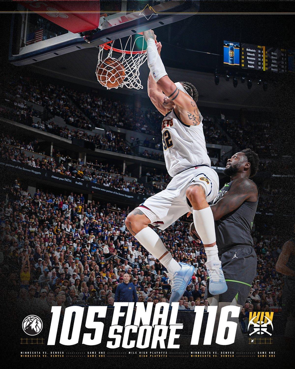 约基奇三双,掘金116-105森林狼,总比分1-0领先。