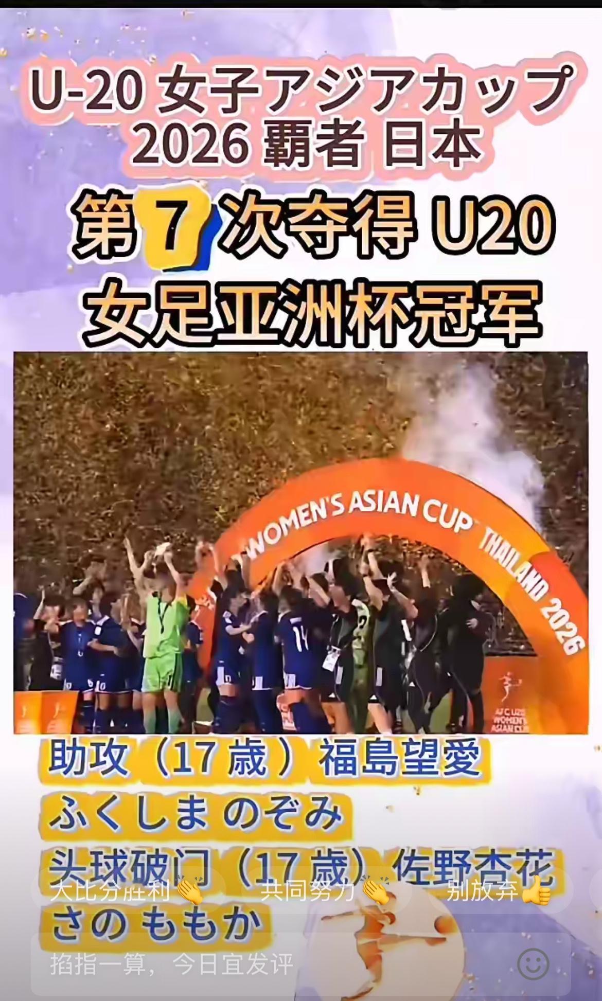 2026年女足U20亚洲杯决赛,日本女足1:0战胜朝鲜女足,获得冠军。