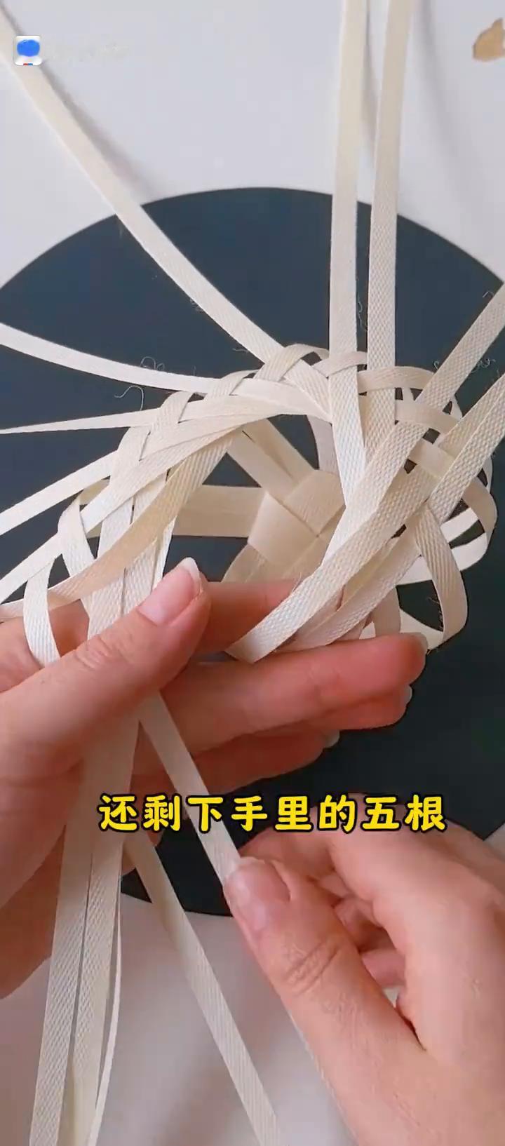 ·第一层折向斜对角,把每一根带子从中间撕开,挨着拿起五根。