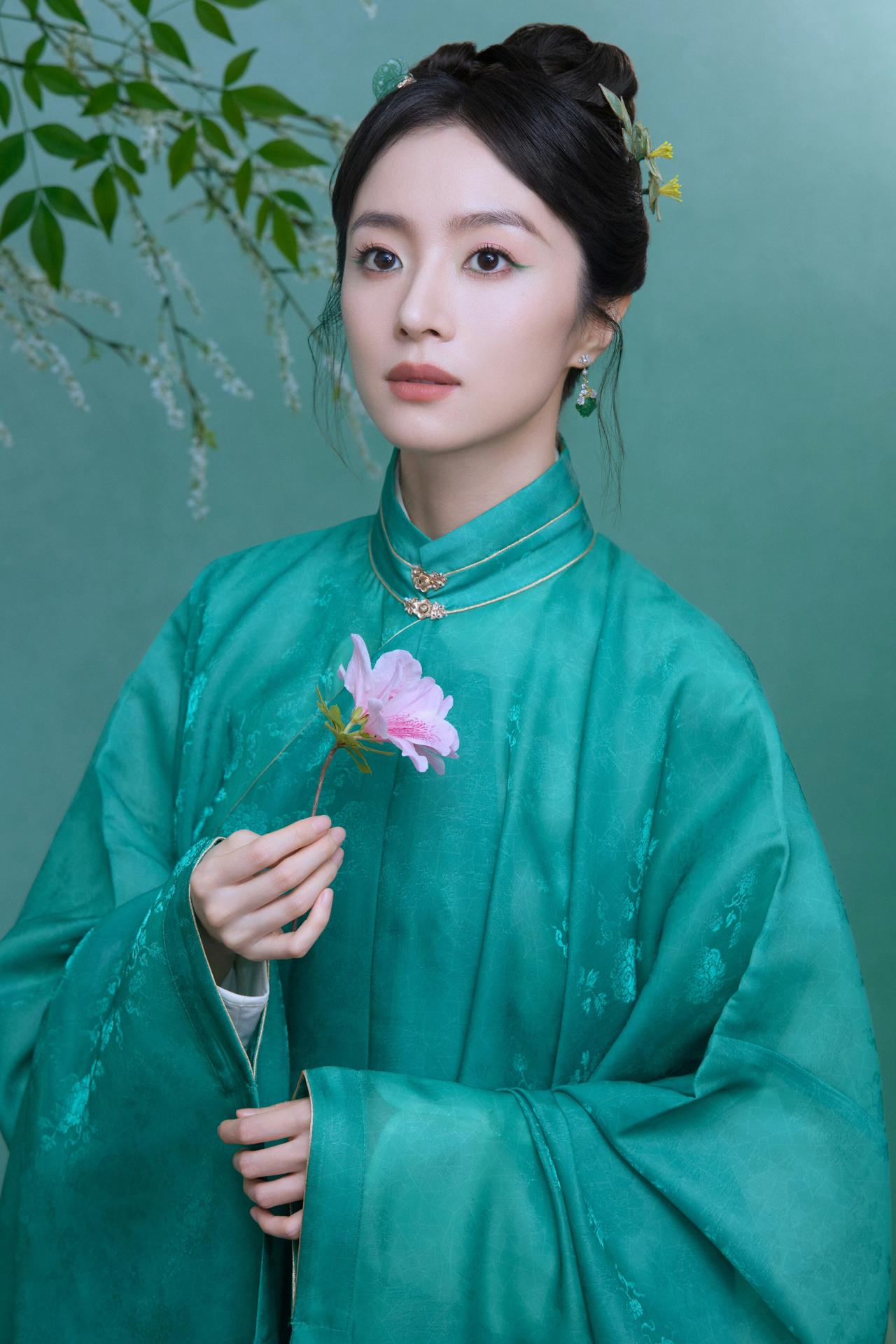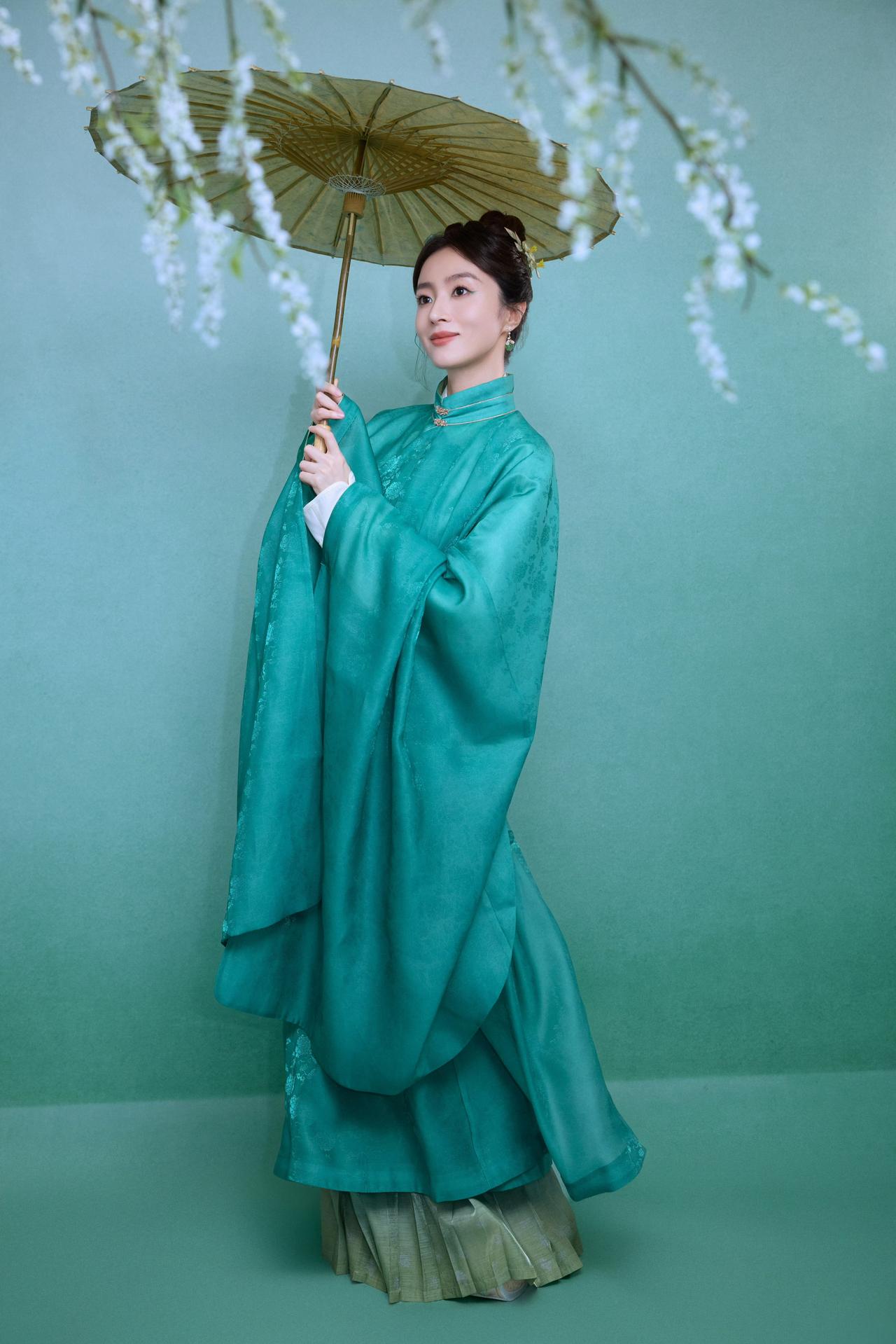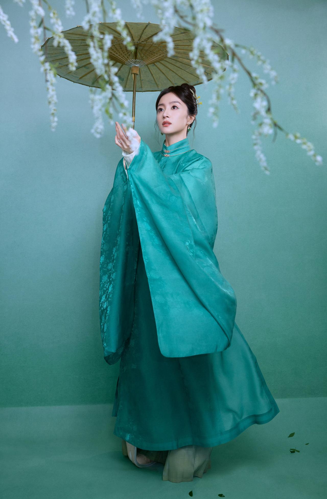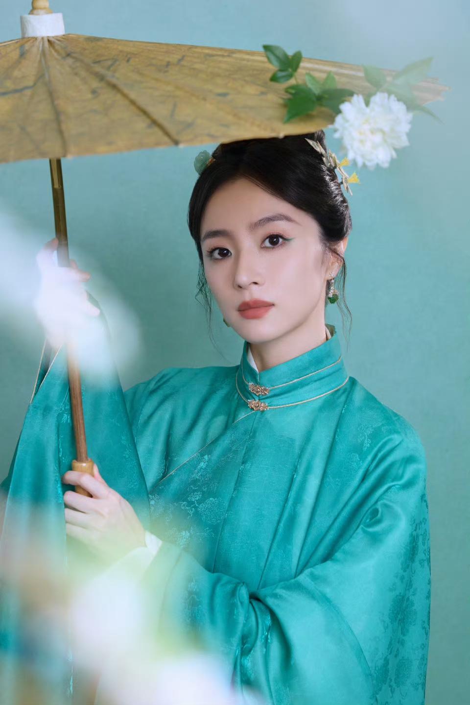 胡冰卿身着明制风格的青绿服饰,手持一把油纸伞,背景有白色花枝与飘落的绿叶,整体营