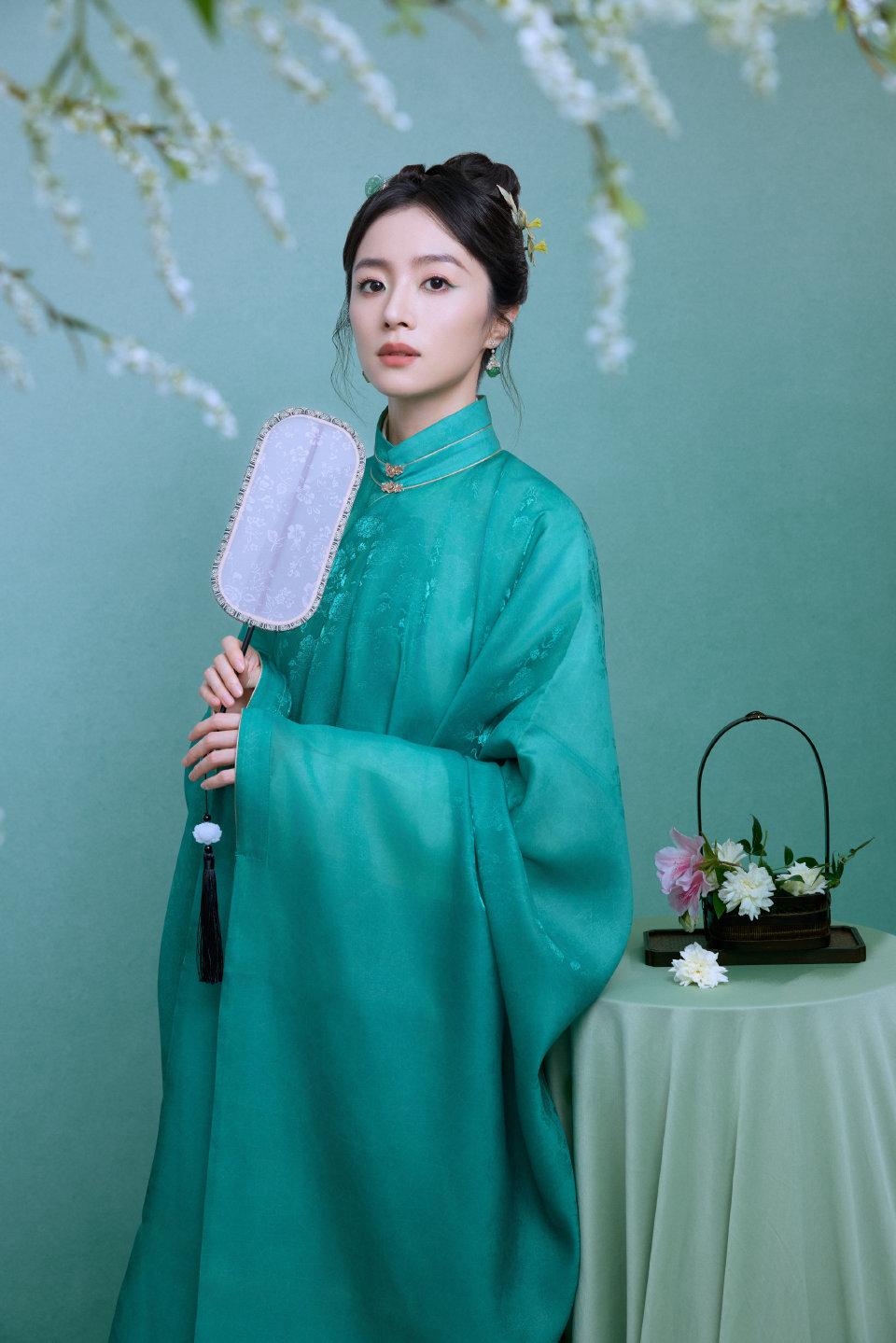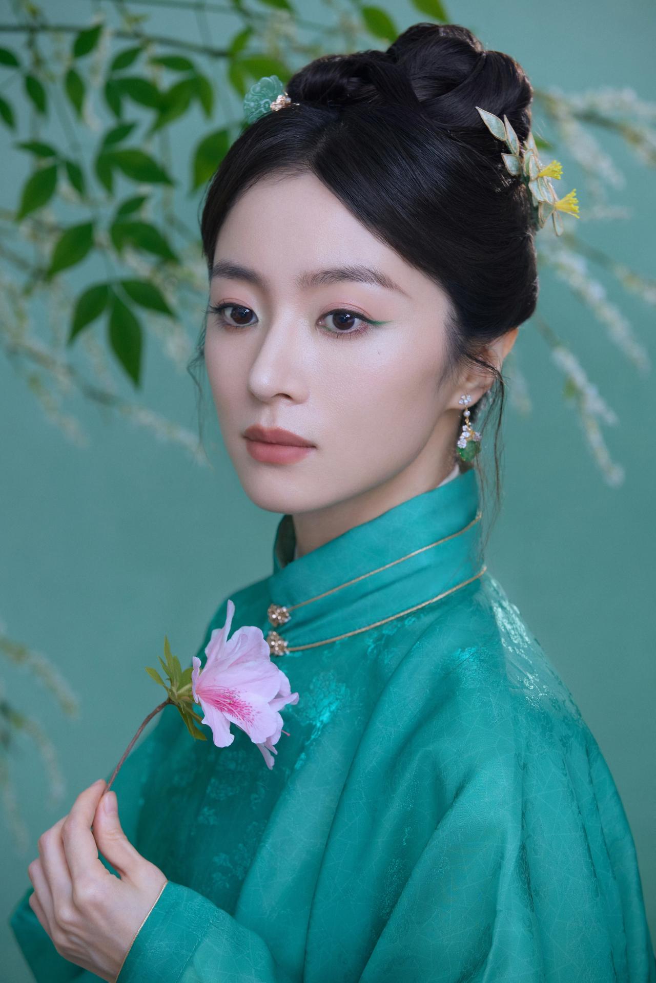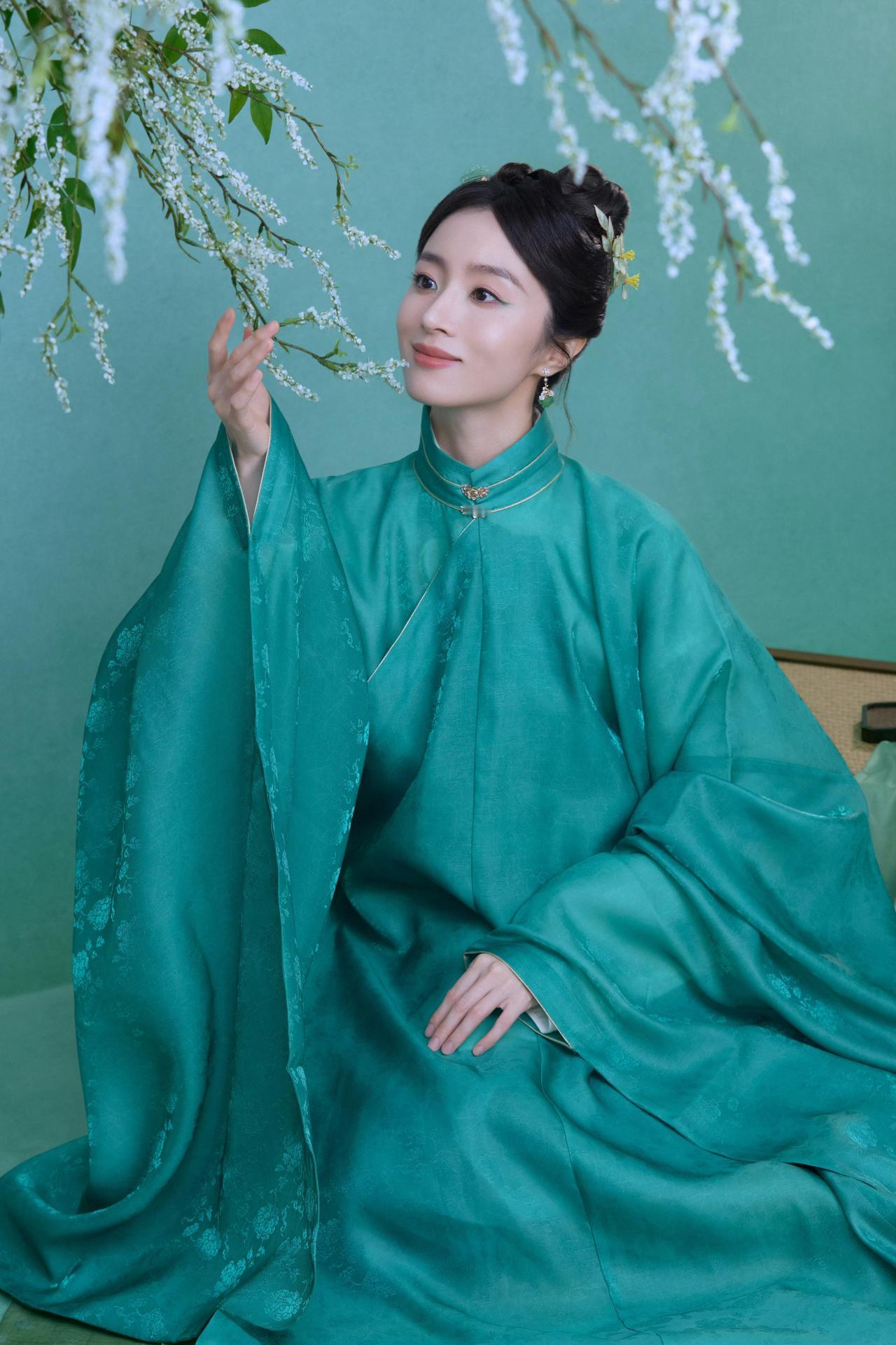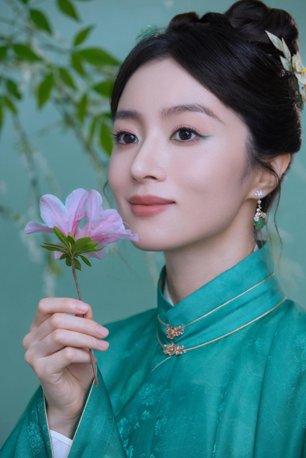 胡冰卿身着明制风格的青绿服饰,手持一把油纸伞,背景有白色花枝与飘落的绿叶,整体营
