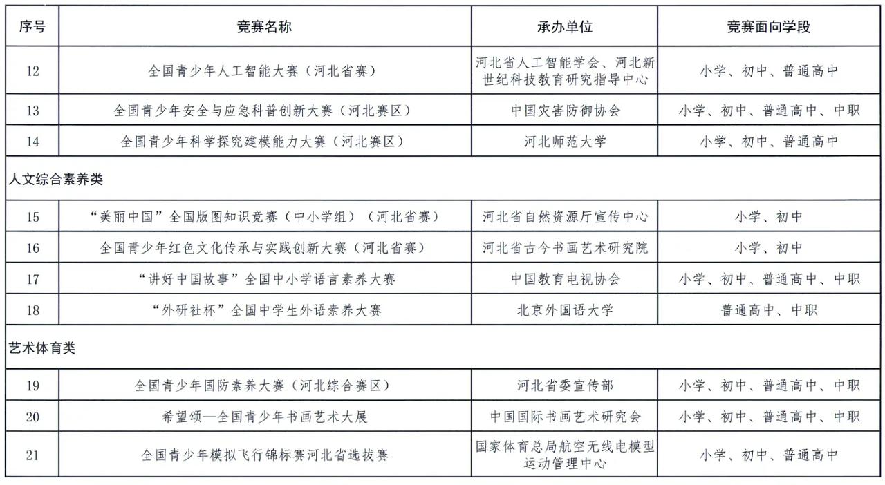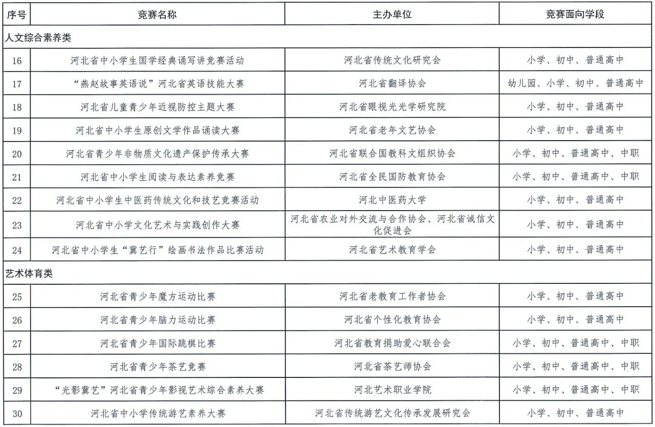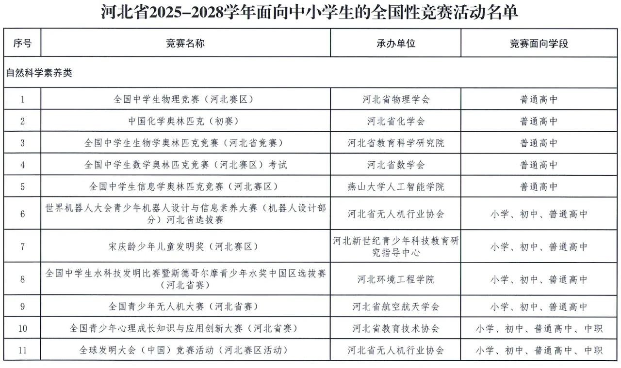 【事关中小学生河北省教育厅最新发布】近日,河北省教育厅正式发布通知,公布了2025—2028学年面向中小学生的全省性竞赛活动名单。 此次公布的竞赛白名单共包含30项全省性竞赛活动和21项在河北省备案举办的全国性竞赛活动。(河北青年报)
