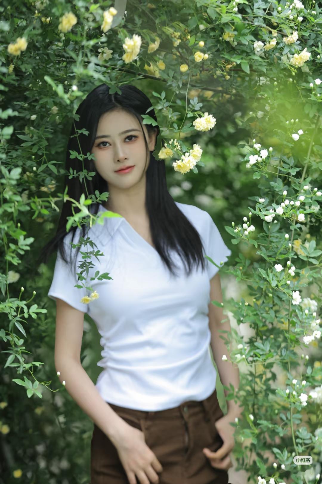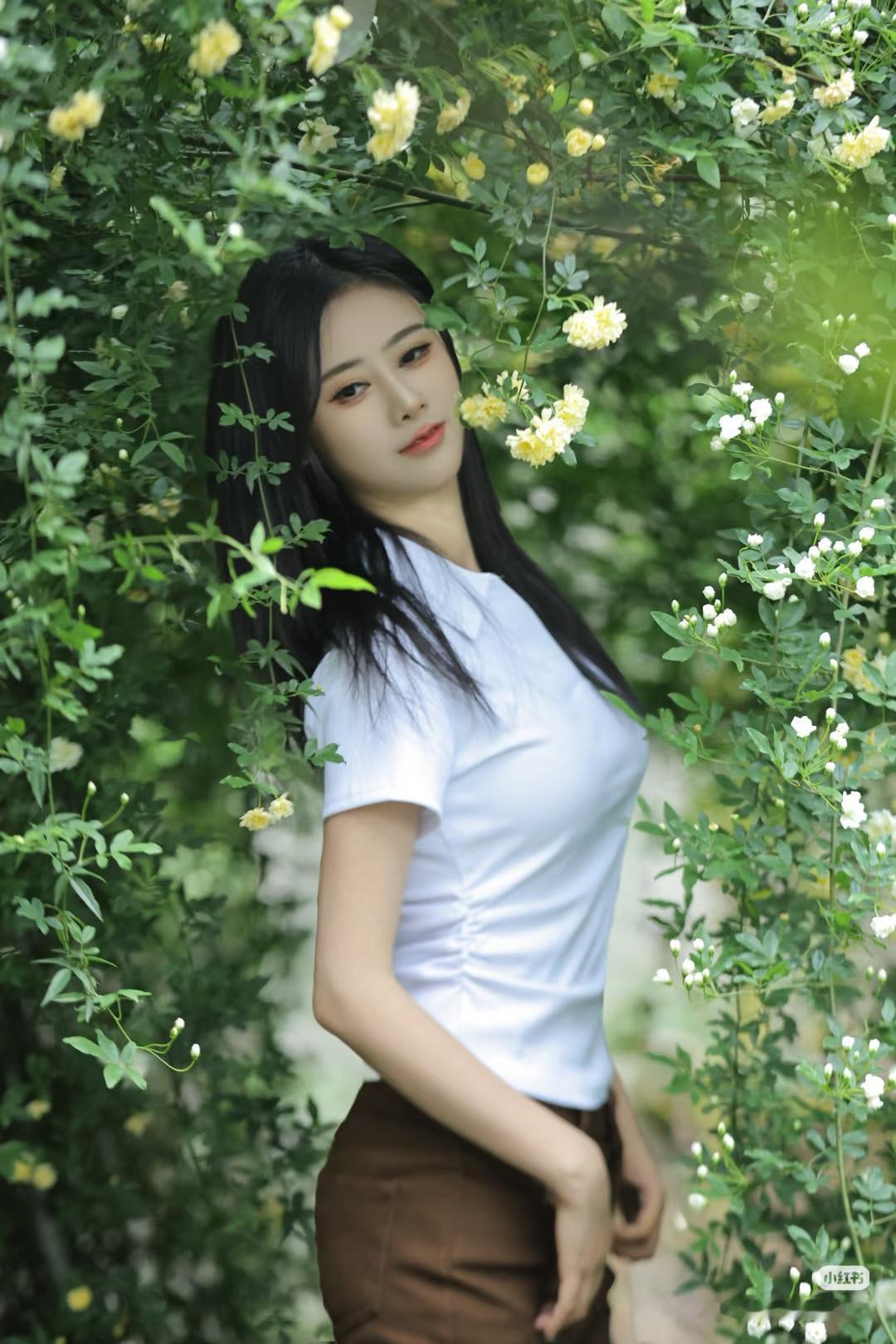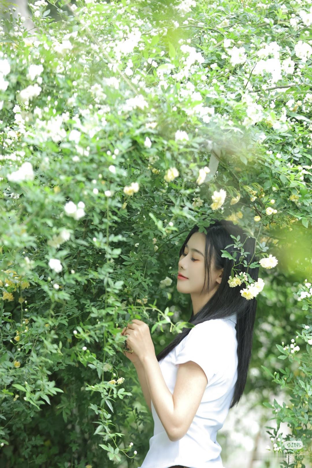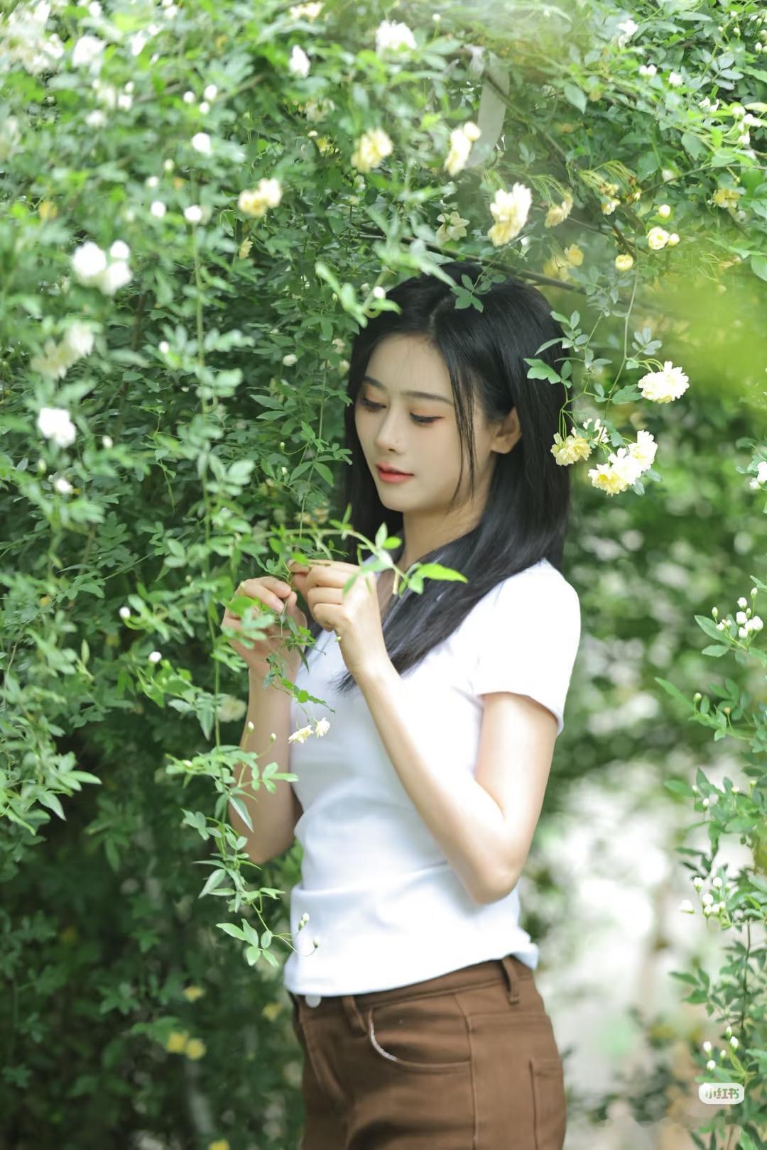 花间美人影,轻抚花枝间。