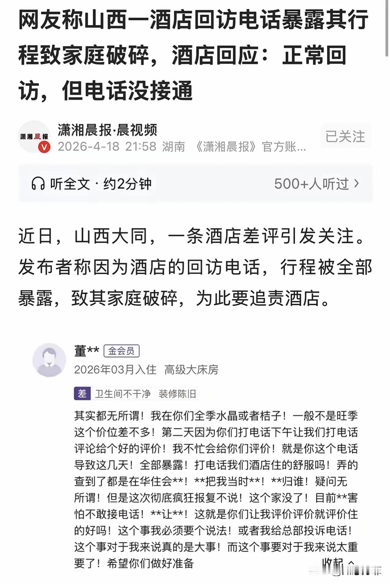 酒店也很无奈,公开回应表示,他们确实打了回访,但电话根本没接通,而且只是正常要好评,没有泄露任何入住信息,没有违规,董女士自己的事暴露,和酒店没关系。